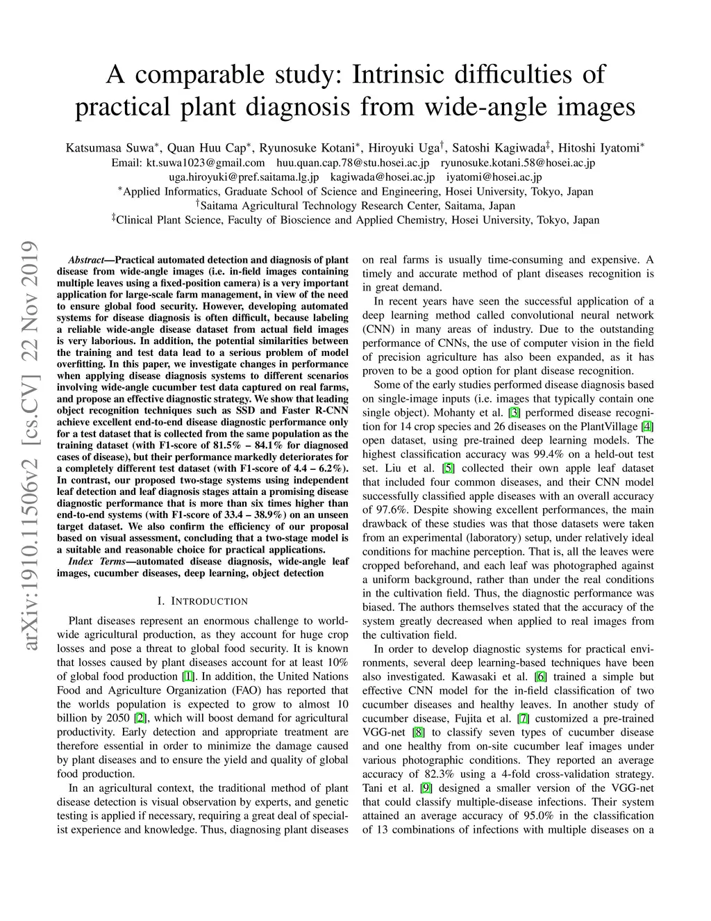 Practical automated detection and diagnosis of plant disease from wide-angle images (i.e. in-field images containing multiple leaves using a fixed-position camera) is a very important application for large-scale farm management, in view of the need to ensure global food security. However, developing automated systems for disease diagnosis is often difficult, because labeling a reliable wide-angle disease dataset from actual field images is very laborious. In addition, the potential similarities between the training and test data lead to a serious problem of model overfitting. In this paper, we investigate changes in performance when applying disease diagnosis systems to different scenarios involving wide-angle cucumber test data captured on real farms, and propose an effective diagnostic strategy. We show that leading object recognition techniques such as SSD and Faster R-CNN achieve excellent end-to-end disease diagnostic performance only for a test dataset that is collected from the same population as the training dataset (with F1-score of 81.5% - 84.1% for diagnosed cases of disease), but their performance markedly deteriorates for a completely different test dataset (with F1-score of 4.4 - 6.2%). In contrast, our proposed two-stage systems using independent leaf detection and leaf diagnosis stages attain a promising disease diagnostic performance that is more than six times higher than end-to-end systems (with F1-score of 33.4 - 38.9%) on an unseen target dataset. We also confirm the efficiency of our proposal based on visual assessment, concluding that a two-stage model is a suitable and reasonable choice for practical applications.
