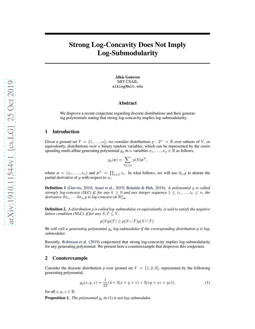 We disprove a recent conjecture regarding discrete distributions and their generating polynomials stating that strong log-concavity implies log-submodularity.