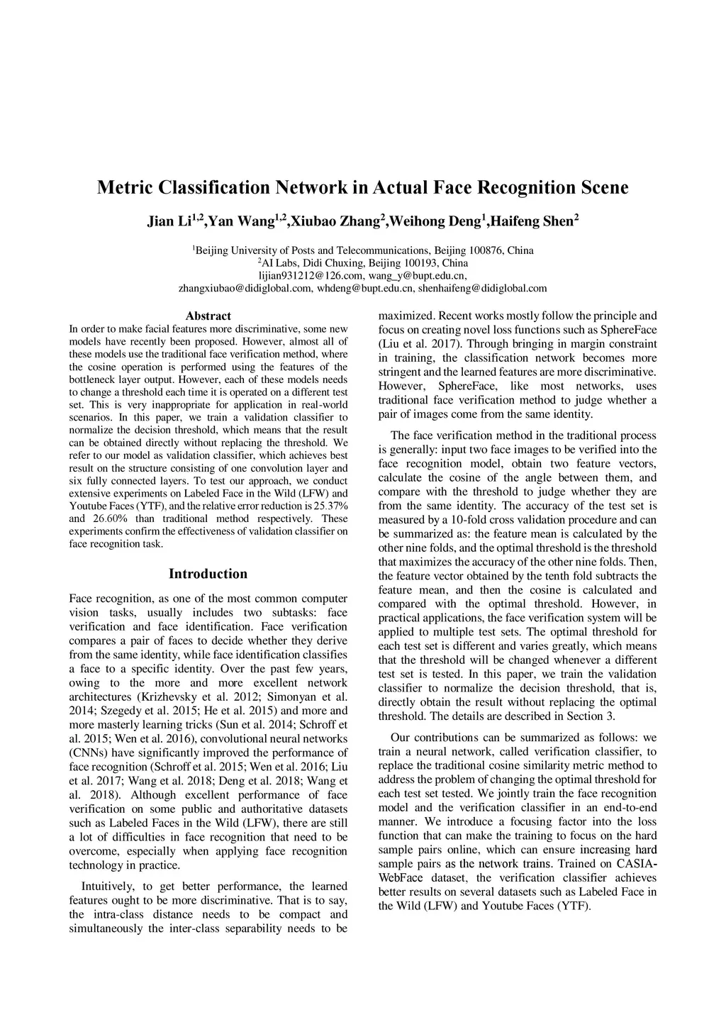 In order to make facial features more discriminative, some new models have recently been proposed. However, almost all of these models use the traditional face verification method, where the cosine operation is performed using the features of the bottleneck layer output. However, each of these models needs to change a threshold each time it is operated on a different test set. This is very inappropriate for application in real-world scenarios. In this paper, we train a validation classifier to normalize the decision threshold, which means that the result can be obtained directly without replacing the threshold. We refer to our model as validation classifier, which achieves best result on the structure consisting of one convolution layer and six fully connected layers. To test our approach, we conduct extensive experiments on Labeled Face in the Wild (LFW) and Youtube Faces (YTF), and the relative error reduction is 25.37% and 26.60% than traditional method respectively. These experiments confirm the effectiveness of validation classifier on face recognition task.