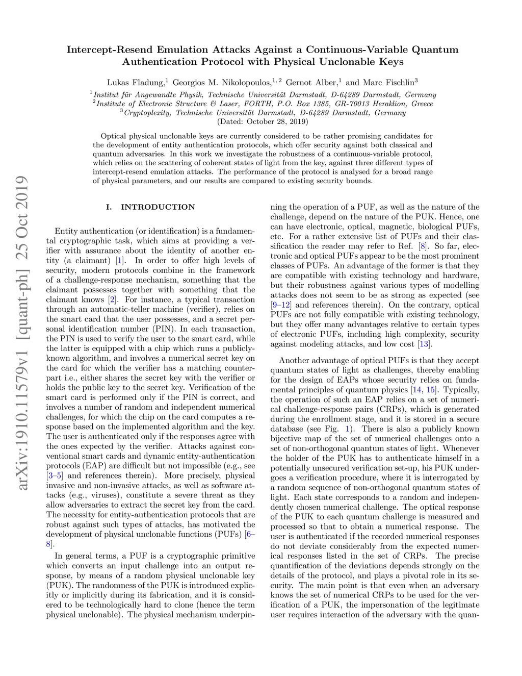 Optical physical unclonable keys are currently considered to be rather promising candidates for the development of entity authentication protocols, which offer security against both classical and quantum adversaries. In this work we investigate the robustness of a continuous-variable protocol, which relies on the scattering of coherent states of light from the key, against three different types of intercept-resend emulation attacks. The performance of the protocol is analysed for a broad range of physical parameters, and our results are compared to existing security bounds.