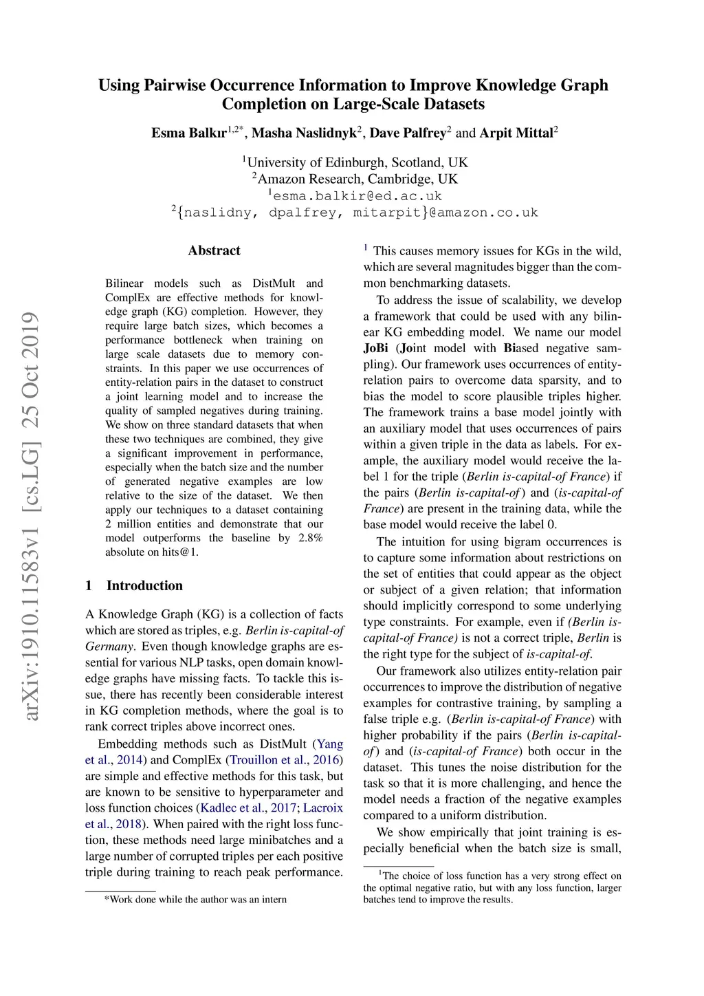 Bilinear models such as DistMult and ComplEx are effective methods for knowledge graph (KG) completion. However, they require large batch sizes, which becomes a performance bottleneck when training on large scale datasets due to memory constraints. In this paper we use occurrences of entity-relation pairs in the dataset to construct a joint learning model and to increase the quality of sampled negatives during training. We show on three standard datasets that when these two techniques are combined, they give a significant improvement in performance, especially when the batch size and the number of generated negative examples are low relative to the size of the dataset. We then apply our techniques to a dataset containing 2 million entities and demonstrate that our model outperforms the baseline by 2.8% absolute on hits@1.