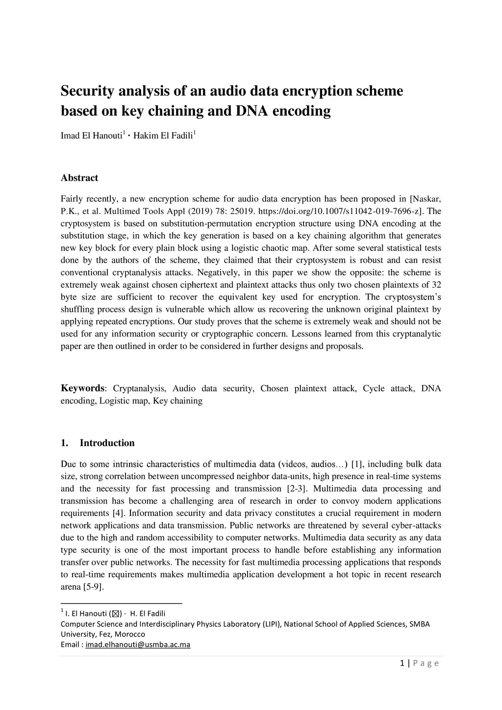 Fairly recently, a new encryption scheme for audio data encryption has been proposed by Naskar, P.K., et al. The cryptosystem is based on substitution-permutation encryption structure using DNA encoding at the substitution stage, in which the key generation is based on a key chaining algorithm that generates new key block for every plain block using a logistic chaotic map. After some several statistical tests done by the authors of the scheme, they claimed that their cryptosystem is robust and can resist conventional cryptanalysis attacks. Negatively, in this paper we show the opposite: the scheme is extremely weak against chosen ciphertext and plaintext attacks thus only two chosen plaintexts of 32 byte size are sufficient to recover the equivalent key used for encryption. The cryptosystem's shuffling process design is vulnerable which allow us recovering the unknown original plaintext by applying repeated encryptions. Our study proves that the scheme is extremely weak and should not be used for any information security or cryptographic concern. Lessons learned from this cryptanalytic paper are then outlined in order to be considered in further designs and proposals.