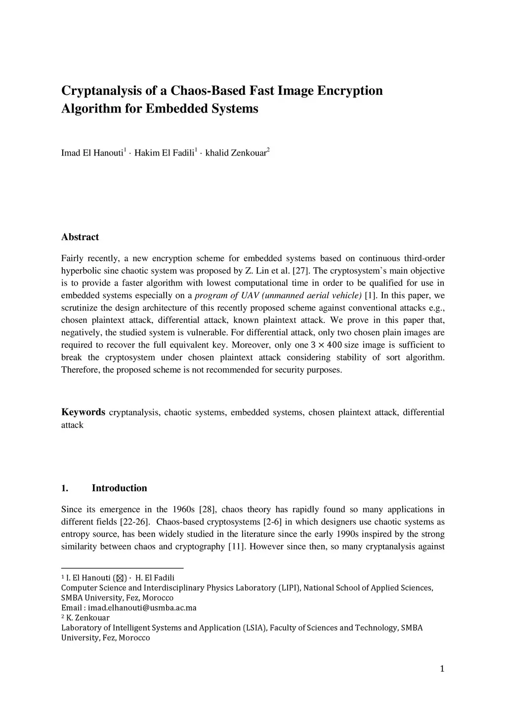 Fairly recently, a new encryption scheme for embedded systems based on continuous third-order hyperbolic sine chaotic system was proposed by Z. Lin et al. The cryptosystem's main objective is to provide a faster algorithm with lowest computational time in order to be qualified for use in embedded systems especially on a program of UAV (unmanned aerial vehicle). In this paper, we scrutinize the design architecture of this recently proposed scheme against conventional attacks e.g., chosen plaintext attack, differential attack, known plaintext attack. We prove in this paper that, negatively, the studied system is vulnerable. For differential attack, only two chosen plain images are required to recover the full equivalent key. Moreover, only one 3x400 size image is sufficient to break the cryptosystem under chosen plaintext attack considering stability of sort algorithm. Therefore, the proposed scheme is not recommended for security purposes.
