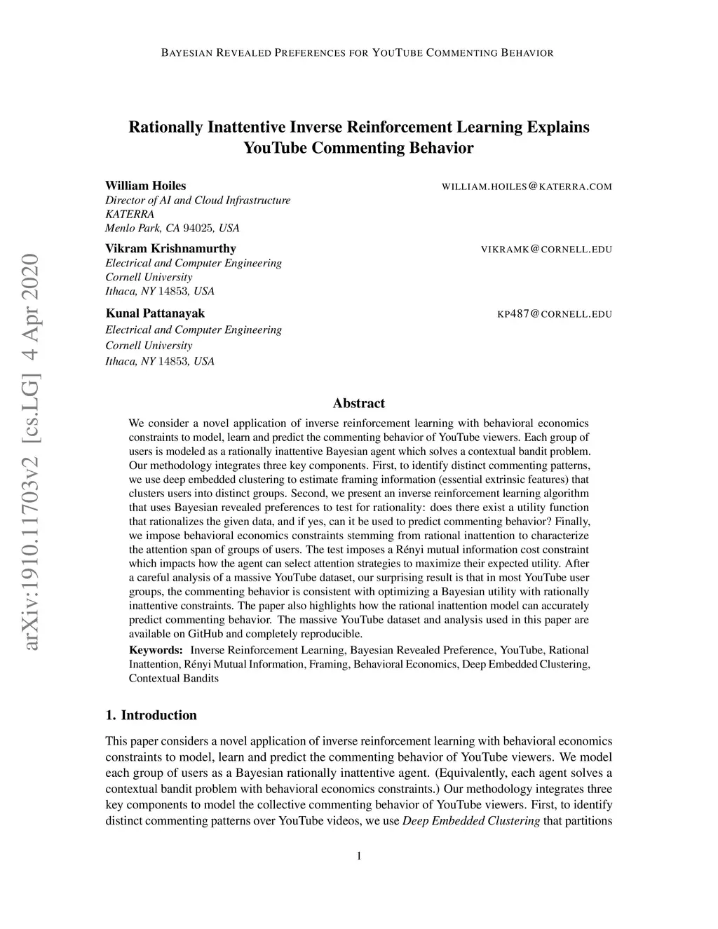 We consider a novel application of inverse reinforcement learning with behavioral economics constraints to model, learn and predict the commenting behavior of YouTube viewers. Each group of users is modeled as a rationally inattentive Bayesian agent which solves a contextual bandit problem. Our methodology integrates three key components. First, to identify distinct commenting patterns, we use deep embedded clustering to estimate framing information (essential extrinsic features) that clusters users into distinct groups.Second, we present an inverse reinforcement learning algorithm that uses Bayesian revealed preferences to test for rationality: does there exist a utility function that rationalizes the given data, and if yes, can it be used to predict commenting behavior? Finally, we impose behavioral economics constraints stemming from rational inattention to characterize the attention span of groups of users. The test imposes a R{\é}nyi mutual information cost constraint which impacts how the agent can select attention strategies to maximize their expected utility. After a careful analysis of a massive YouTube dataset, our surprising result is that in most YouTube user groups, the commenting behavior is consistent with optimizing a Bayesian utility with rationally inattentive constraints. The paper also highlights how the rational inattention model can accurately predict commenting behavior. The massive YouTube dataset and analysis used in this paper are available on GitHub and completely reproducible.