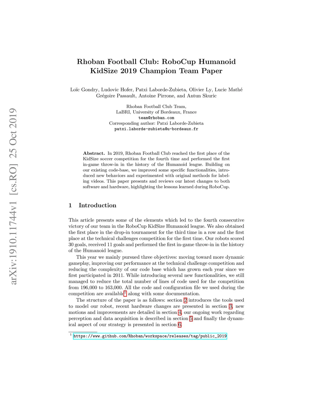 In 2019, Rhoban Football Club reached the first place of the KidSize soccer competition for the fourth time and performed the first in-game throw-in in the history of the Humanoid league. Building on our existing code-base, we improved some specific functionalities, introduced new behaviors and experimented with original methods for labeling videos. This paper presents and reviews our latest changes to both software and hardware, highlighting the lessons learned during RoboCup.