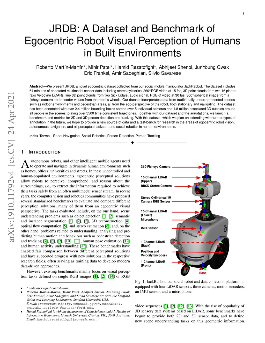 We present JRDB, a novel egocentric dataset collected from our social mobile manipulator JackRabbot. The dataset includes 64 minutes of annotated multimodal sensor data including stereo cylindrical 360 RGB video at 15 fps, 3D point clouds from two Velodyne 16 Lidars, line 3D point clouds from two Sick Lidars, audio signal, RGB-D video at 30 fps, 360 spherical image from a fisheye camera and encoder values from the robot's wheels. Our dataset incorporates data from traditionally underrepresented scenes such as indoor environments and pedestrian areas, all from the ego-perspective of the robot, both stationary and navigating. The dataset has been annotated with over 2.3 million bounding boxes spread over 5 individual cameras and 1.8 million associated 3D cuboids around all people in the scenes totaling over 3500 time consistent trajectories. Together with our dataset and the annotations, we launch a benchmark and metrics for 2D and 3D person detection and tracking. With this dataset, which we plan on extending with further types of annotation in the future, we hope to provide a new source of data and a test-bench for research in the areas of egocentric robot vision, autonomous navigation, and all perceptual tasks around social robotics in human environments.
