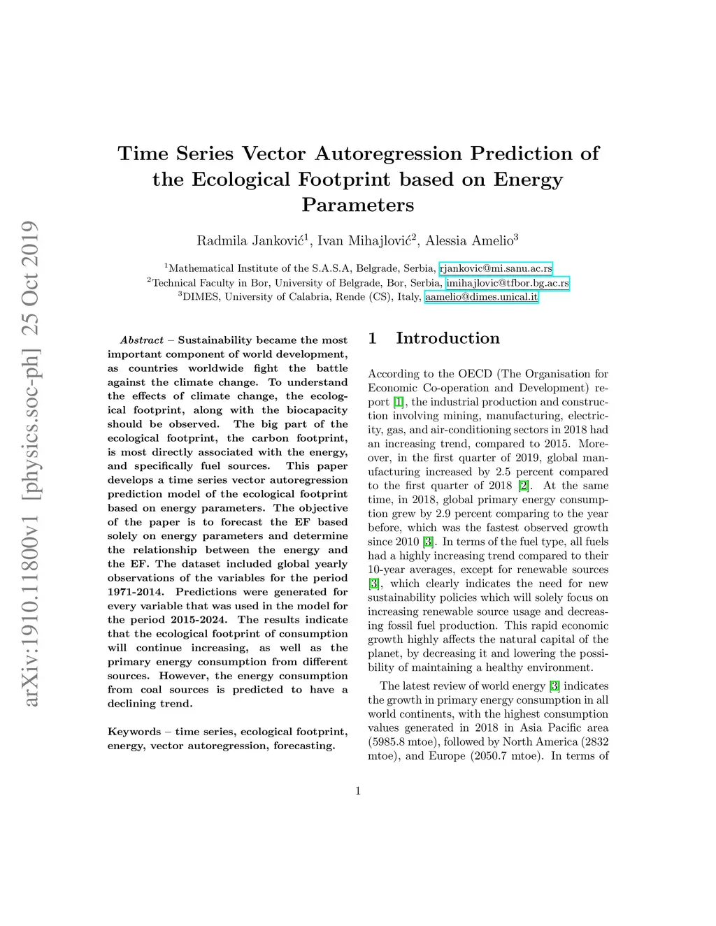 Sustainability became the most important component of world development, as countries worldwide fight the battle against the climate change. To understand the effects of climate change, the ecological footprint, along with the biocapacity should be observed. The big part of the ecological footprint, the carbon footprint, is most directly associated with the energy, and specifically fuel sources. This paper develops a time series vector autoregression prediction model of the ecological footprint based on energy parameters. The objective of the paper is to forecast the EF based solely on energy parameters and determine the relationship between the energy and the EF. The dataset included global yearly observations of the variables for the period 1971-2014. Predictions were generated for every variable that was used in the model for the period 2015-2024. The results indicate that the ecological footprint of consumption will continue increasing, as well as the primary energy consumption from different sources. However, the energy consumption from coal sources is predicted to have a declining trend.