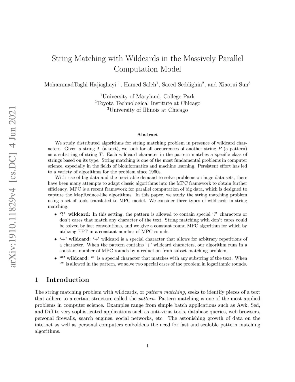 We study distributed algorithms for string matching problem in presence of wildcard characters. Given a string T (a text), we look for all occurrences of another string P (a pattern) as a substring of string T . Each wildcard character in the pattern matches a specific class of strings based on its type. String matching is one of the most fundamental problems in computer science, especially in the fields of bioinformatics and machine learning. Persistent effort has led to a variety of algorithms for the problem since 1960s. With rise of big data and the inevitable demand to solve problems on huge data sets, there have been many attempts to adapt classic algorithms into the MPC framework to obtain further efficiency. MPC is a recent framework for parallel computation of big data, which is designed to capture the MapReduce-like algorithms. In this paper, we study the string matching problem using a set of tools translated to MPC model. We consider three types of wildcards in string matching: - '?' wildcard: In this setting, the pattern is allowed to contain special '?' characters or don't cares that match any character of the text. String matching with don't cares could be solved by fast convolutions, and we give a constant round MPC algorithm for which by utilizing FFT in a constant number of MPC rounds. - '+' wildcard: '+' wildcard is a special character that allows for arbitrary repetitions of a character. When the pattern contains '+' wildcard characters, our algorithm runs in a constant number of MPC rounds by a reduction from subset matching problem. - '*' wildcard: '*' is a special character that matches with any substring of the text. When '*' is allowed in the pattern, we solve two special cases of the problem in logarithmic rounds.