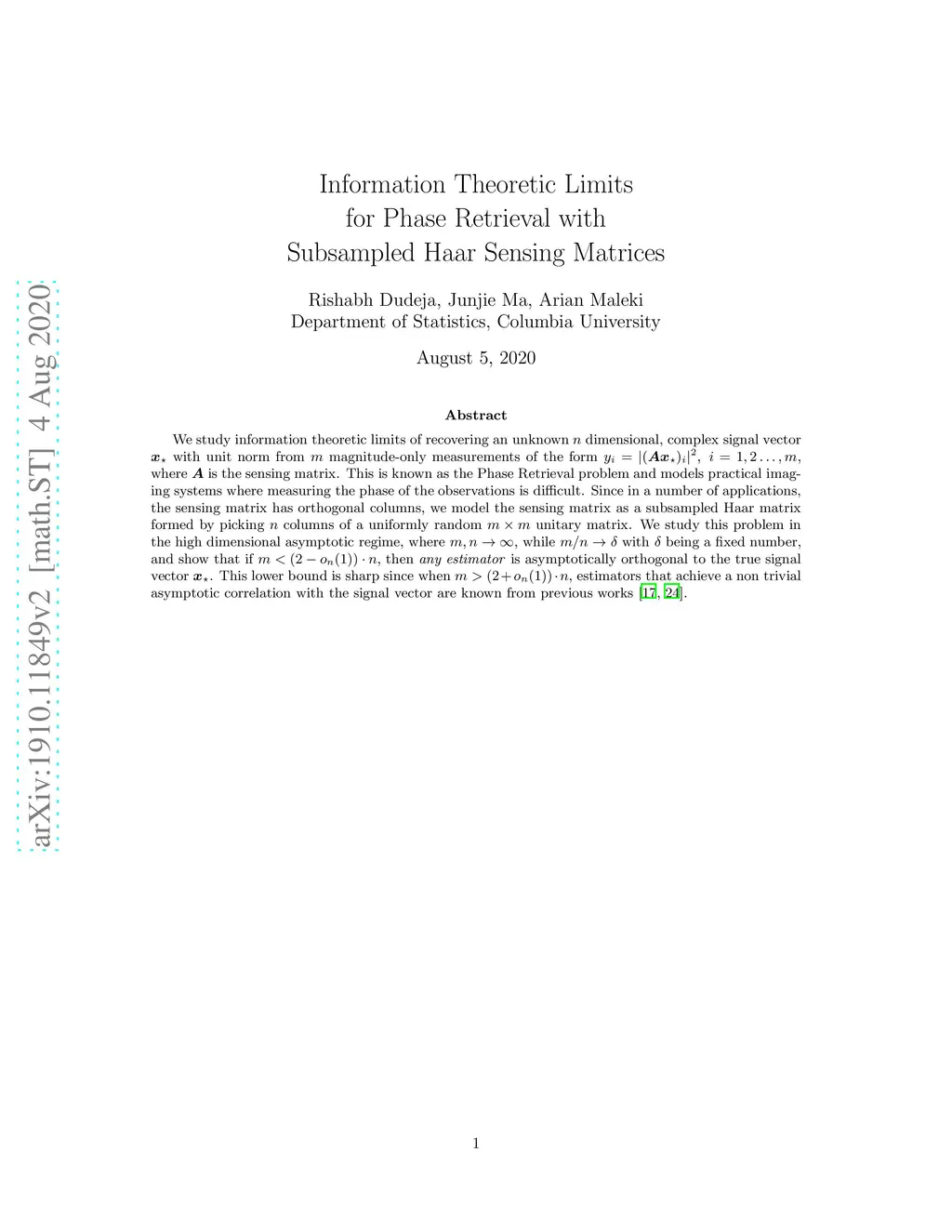 We study information theoretic limits of recovering an unknown dimensional, complex signal vector with unit norm from magnitude-only measurements of the form , where is the sensing matrix. This is known as the Phase Retrieval problem and models practical imaging systems where measuring the phase of the observations is difficult. Since in a number of applications, the sensing matrix has orthogonal columns, we model the sensing matrix as a subsampled Haar matrix formed by picking columns of a uniformly random unitary matrix. We study this problem in the high dimensional asymptotic regime, where , while with being a fixed number, and show that if , then any estimator is asymptotically orthogonal to the true signal vector . This lower bound is sharp since when $m > (2+o_n(1)) \cdot n $, estimators that achieve a non trivial asymptotic correlation with the signal vector are known from previous works.