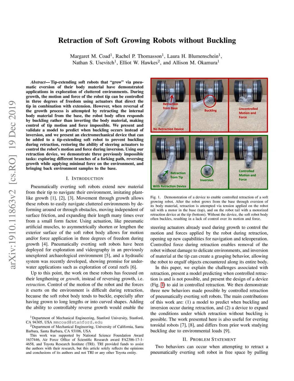 Tip-extending soft robots that "grow" via pneumatic eversion of their body material have demonstrated applications in exploration of cluttered environments. During growth, the motion and force of the robot tip can be controlled in three degrees of freedom using actuators that direct the tip in combination with extension. However, when reversal of the growth process is attempted by retracting the internal body material from the base, the robot body often responds by buckling rather than inverting the body material, making control of tip motion and force impossible. We present and validate a model to predict when buckling occurs instead of inversion, and we present an electromechanical device that can be added to a tip-extending soft robot to prevent buckling during retraction, restoring the ability of steering actuators to control the robot's motion and force during inversion. Using our retraction device, we demonstrate three previously impossible tasks: exploring different branches of a forking path, reversing growth while applying minimal force on the environment, and bringing back environment samples to the base.
