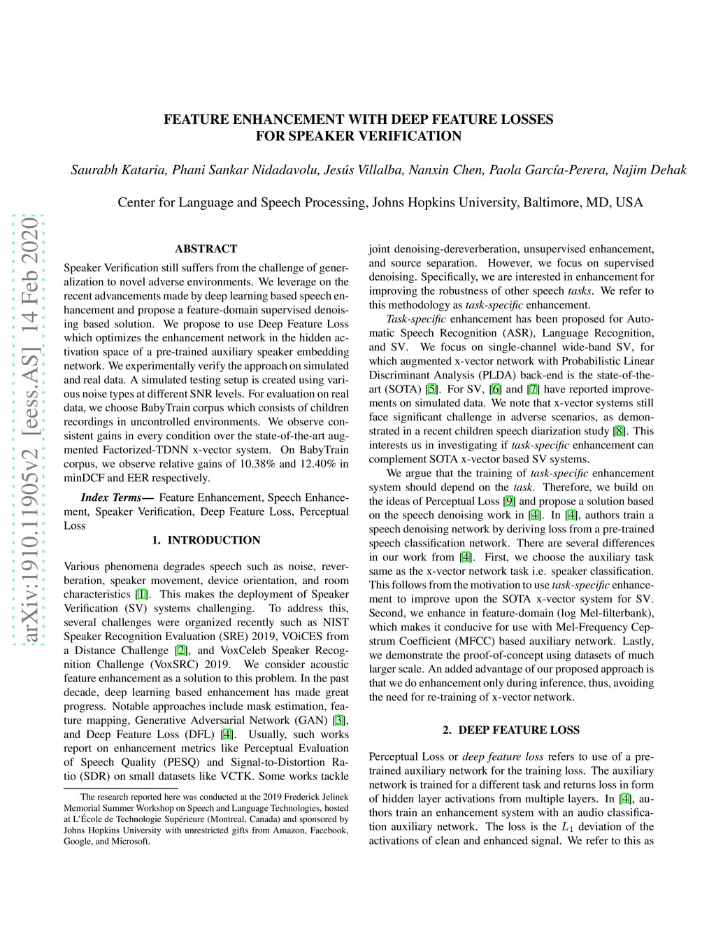Feature Enhancement with Deep Feature Losses for Speaker Verification