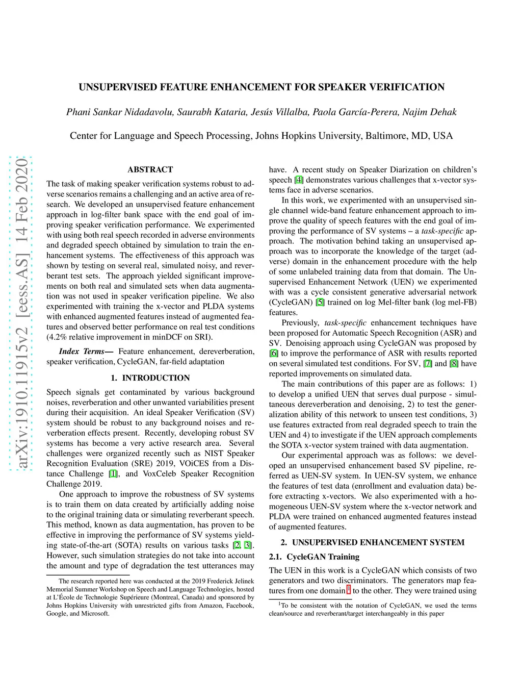 The task of making speaker verification systems robust to adverse scenarios remain a challenging and an active area of research. We developed an unsupervised feature enhancement approach in log-filter bank domain with the end goal of improving speaker verification performance. We experimented with using both real speech recorded in adverse environments and degraded speech obtained by simulation to train the enhancement systems. The effectiveness of the approach was shown by testing on several real, simulated noisy, and reverberant test sets. The approach yielded significant improvements on both real and simulated sets when data augmentation was not used in speaker verification pipeline or augmentation was used only during x-vector training. When data augmentation was used for x-vector and PLDA training, our enhancement approach yielded slight improvements.