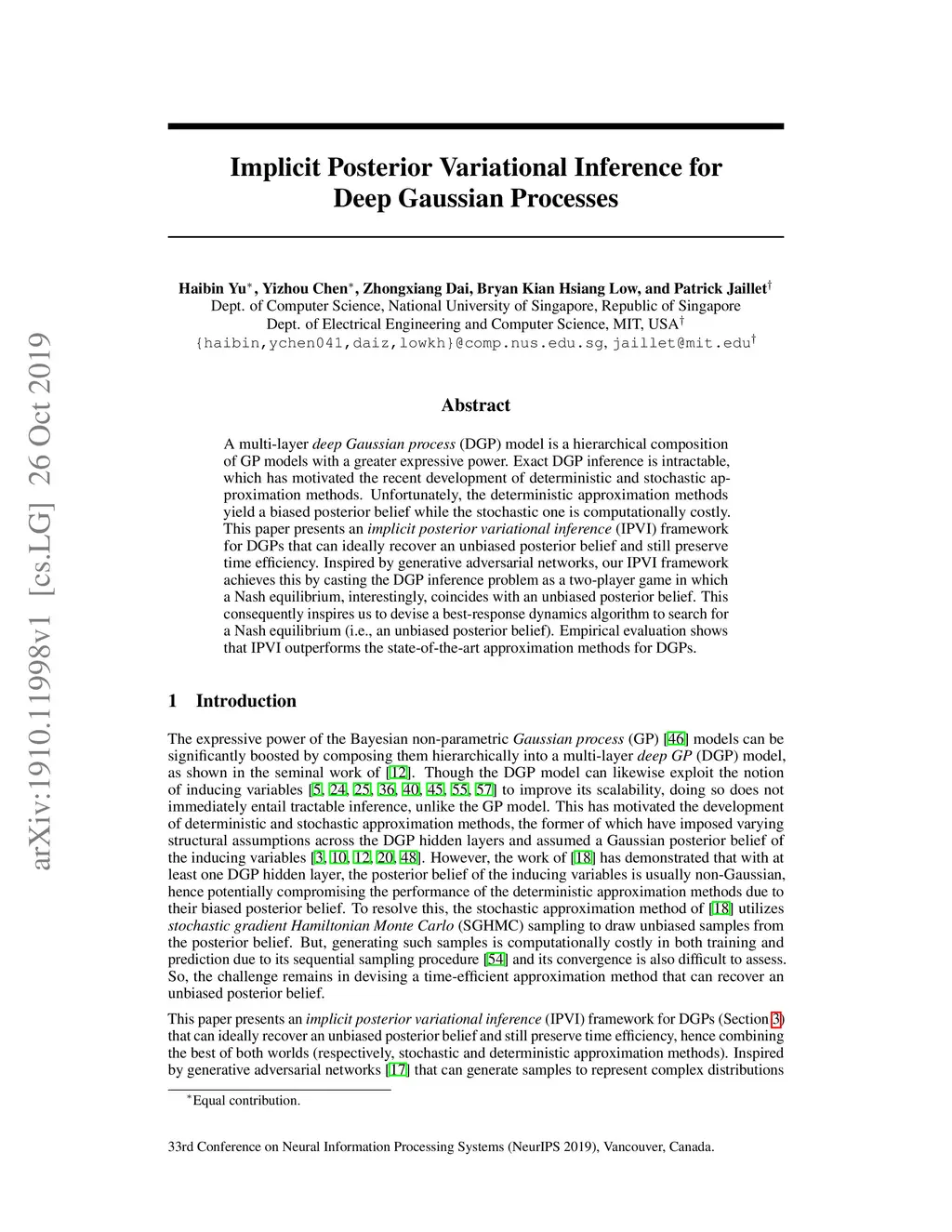 A multi-layer deep Gaussian process (DGP) model is a hierarchical composition of GP models with a greater expressive power. Exact DGP inference is intractable, which has motivated the recent development of deterministic and stochastic approximation methods. Unfortunately, the deterministic approximation methods yield a biased posterior belief while the stochastic one is computationally costly. This paper presents an implicit posterior variational inference (IPVI) framework for DGPs that can ideally recover an unbiased posterior belief and still preserve time efficiency. Inspired by generative adversarial networks, our IPVI framework achieves this by casting the DGP inference problem as a two-player game in which a Nash equilibrium, interestingly, coincides with an unbiased posterior belief. This consequently inspires us to devise a best-response dynamics algorithm to search for a Nash equilibrium (i.e., an unbiased posterior belief). Empirical evaluation shows that IPVI outperforms the state-of-the-art approximation methods for DGPs.