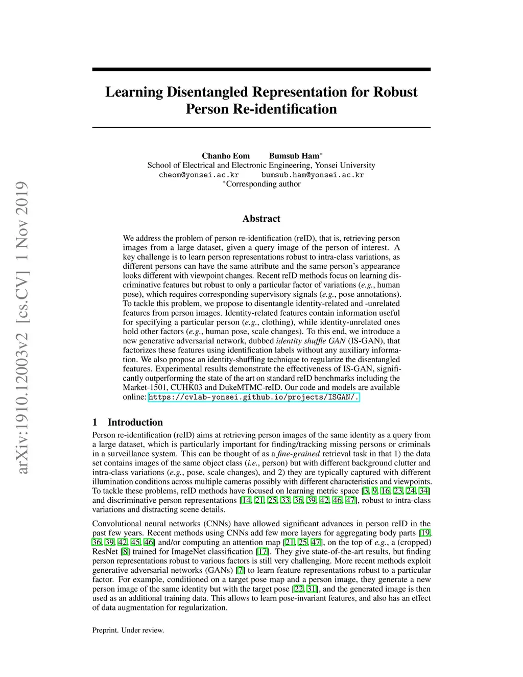 We address the problem of person re-identification (reID), that is, retrieving person images from a large dataset, given a query image of the person of interest. A key challenge is to learn person representations robust to intra-class variations, as different persons can have the same attribute and the same person's appearance looks different with viewpoint changes. Recent reID methods focus on learning discriminative features but robust to only a particular factor of variations (e.g., human pose), which requires corresponding supervisory signals (e.g., pose annotations). To tackle this problem, we propose to disentangle identity-related and -unrelated features from person images. Identity-related features contain information useful for specifying a particular person (e.g., clothing), while identity-unrelated ones hold other factors (e.g., human pose, scale changes). To this end, we introduce a new generative adversarial network, dubbed \emph{identity shuffle GAN} (IS-GAN), that factorizes these features using identification labels without any auxiliary information. We also propose an identity-shuffling technique to regularize the disentangled features. Experimental results demonstrate the effectiveness of IS-GAN, significantly outperforming the state of the art on standard reID benchmarks including the Market-1501, CUHK03 and DukeMTMC-reID. Our code and models are available online: https://cvlab-yonsei.github.io/projects/ISGAN/.