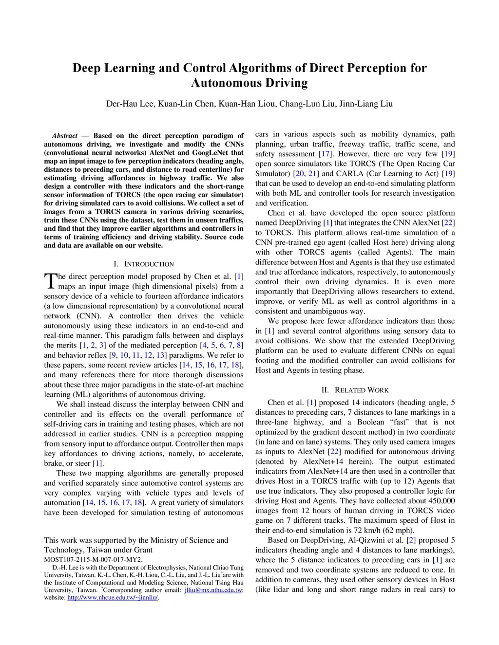 Deep Learning and Control Algorithms of Direct Perception for Autonomous