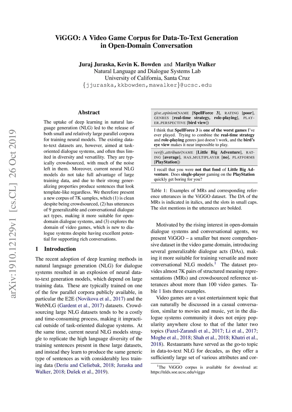The uptake of deep learning in natural language generation (NLG) led to the release of both small and relatively large parallel corpora for training neural models. The existing data-to-text datasets are, however, aimed at task-oriented dialogue systems, and often thus limited in diversity and versatility. They are typically crowdsourced, with much of the noise left in them. Moreover, current neural NLG models do not take full advantage of large training data, and due to their strong generalizing properties produce sentences that look template-like regardless. We therefore present a new corpus of 7K samples, which (1) is clean despite being crowdsourced, (2) has utterances of 9 generalizable and conversational dialogue act types, making it more suitable for open-domain dialogue systems, and (3) explores the domain of video games, which is new to dialogue systems despite having excellent potential for supporting rich conversations.