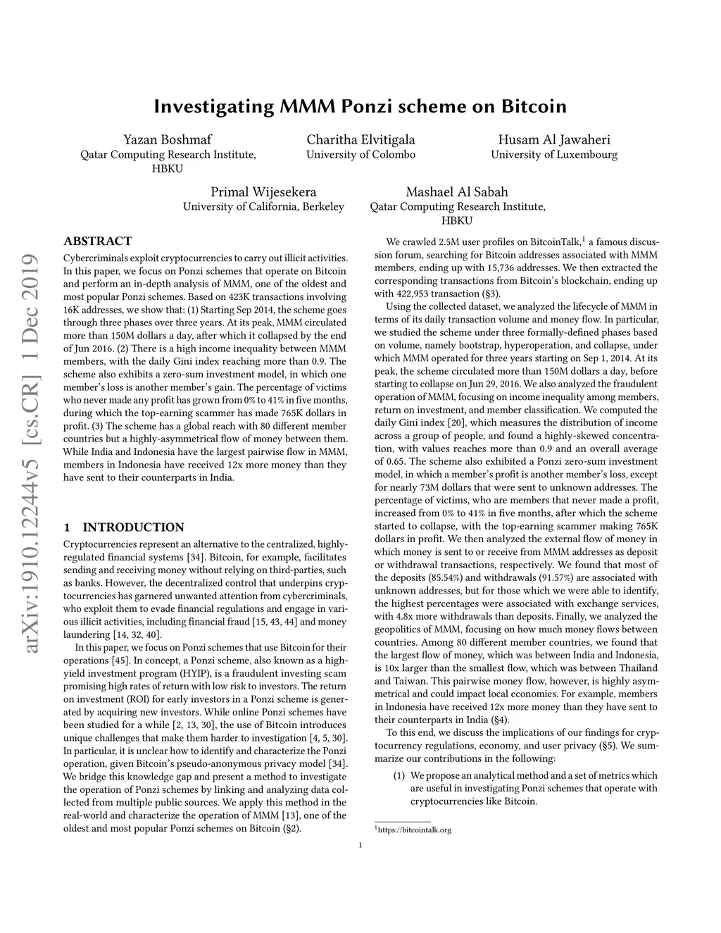 Cybercriminals exploit cryptocurrencies to carry out illicit activities. In this paper, we focus on Ponzi schemes that operate on Bitcoin and perform an in-depth analysis of MMM, one of the oldest and most popular Ponzi schemes. Based on 423K transactions involving 16K addresses, we show that: (1) Starting Sep 2014, the scheme goes through three phases over three years. At its peak, MMM circulated more than 150M dollars a day, after which it collapsed by the end of Jun 2016. (2) There is a high income inequality between MMM members, with the daily Gini index reaching more than 0.9. The scheme also exhibits a zero-sum investment model, in which one member's loss is another member's gain. The percentage of victims who never made any profit has grown from 0% to 41% in five months, during which the top-earning scammer has made 765K dollars in profit. (3) The scheme has a global reach with 80 different member countries but a highly-asymmetrical flow of money between them. While India and Indonesia have the largest pairwise flow in MMM, members in Indonesia have received 12x more money than they have sent to their counterparts in India.