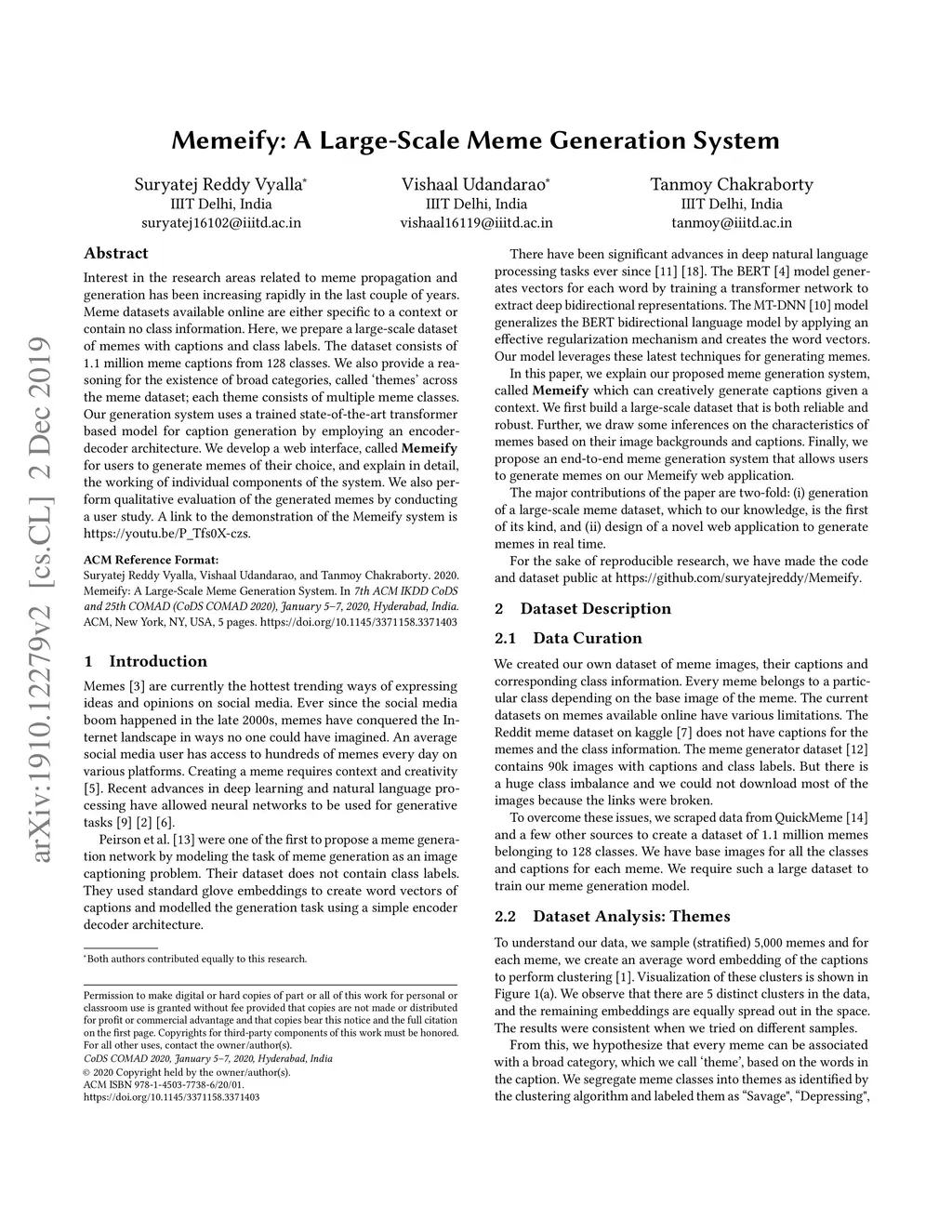 Interest in the research areas related to meme propagation and generation has been increasing rapidly in the last couple of years. Meme datasets available online are either specific to a context or contain no class information. Here, we prepare a large-scale dataset of memes with captions and class labels. The dataset consists of 1.1 million meme captions from 128 classes. We also provide reasoning for the existence of broad categories, called "themes" across the meme dataset; each theme consists of multiple meme classes. Our generation system uses a trained state-of-the-art transformer-based model for caption generation by employing an encoder-decoder architecture. We develop a web interface, called Memeify for users to generate memes of their choice, and explain in detail, the working of individual components of the system. We also perform a qualitative evaluation of the generated memes by conducting a user study. A link to the demonstration of the Memeify system is https://youtu.be/P_Tfs0X-czs.