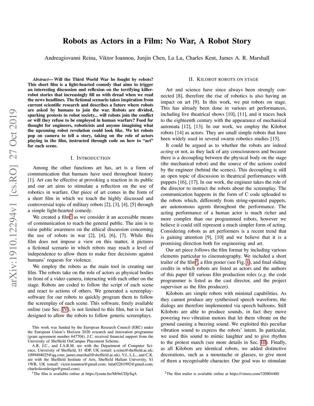 Will the Third World War be fought by robots? This short film is a light-hearted comedy that aims to trigger an interesting discussion and reflexion on the terrifying killer-robot stories that increasingly fill us with dread when we read the news headlines. The fictional scenario takes inspiration from current scientific research and describes a future where robots are asked by humans to join the war. Robots are divided, sparking protests in robot society... will robots join the conflict or will they refuse to be employed in human warfare? Food for thought for engineers, roboticists and anyone imagining what the upcoming robot revolution could look like. We let robots pop on camera to tell a story, taking on the role of actors playing in the film, instructed through code on how to "act" for each scene.