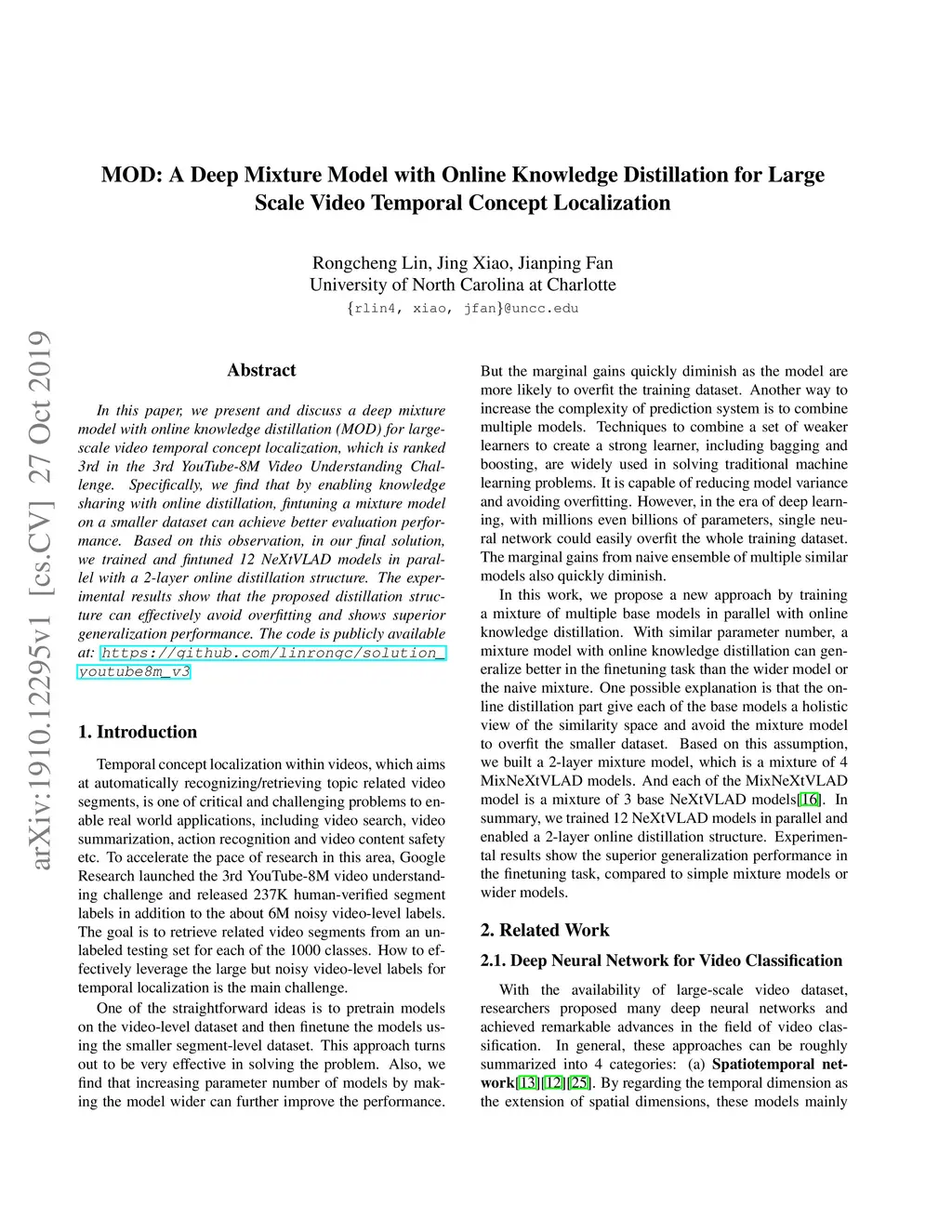 In this paper, we present and discuss a deep mixture model with online knowledge distillation (MOD) for large-scale video temporal concept localization, which is ranked 3rd in the 3rd YouTube-8M Video Understanding Challenge. Specifically, we find that by enabling knowledge sharing with online distillation, fintuning a mixture model on a smaller dataset can achieve better evaluation performance. Based on this observation, in our final solution, we trained and fintuned 12 NeXtVLAD models in parallel with a 2-layer online distillation structure. The experimental results show that the proposed distillation structure can effectively avoid overfitting and shows superior generalization performance. The code is publicly available at: https://github.com/linrongc/solution_youtube8m_v3