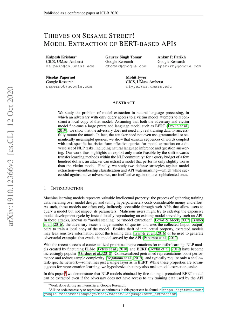Thieves on Sesame Street! Model Extraction of BERT-based APIs