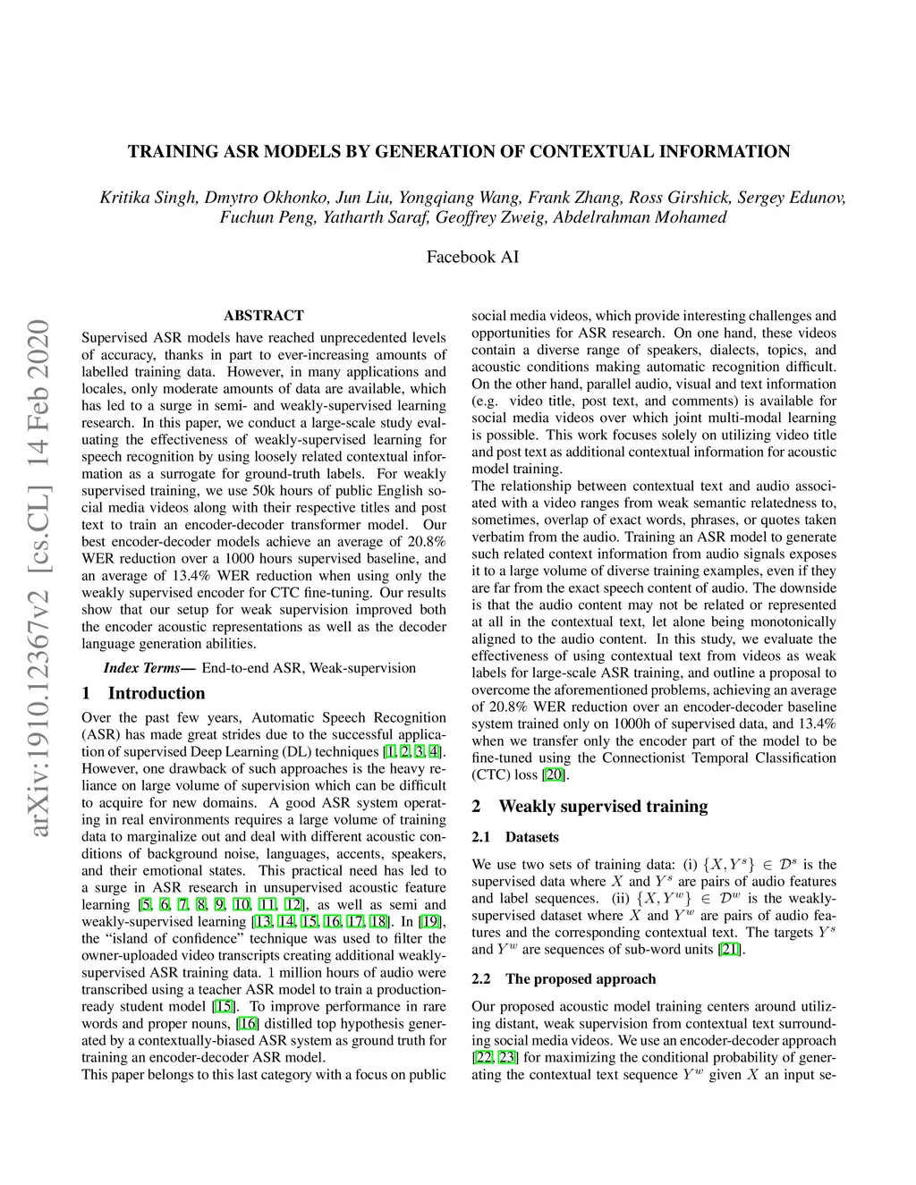 Supervised ASR models have reached unprecedented levels of accuracy, thanks in part to ever-increasing amounts of labelled training data. However, in many applications and locales, only moderate amounts of data are available, which has led to a surge in semi- and weakly-supervised learning research. In this paper, we conduct a large-scale study evaluating the effectiveness of weakly-supervised learning for speech recognition by using loosely related contextual information as a surrogate for ground-truth labels. For weakly supervised training, we use 50k hours of public English social media videos along with their respective titles and post text to train an encoder-decoder transformer model. Our best encoder-decoder models achieve an average of 20.8% WER reduction over a 1000 hours supervised baseline, and an average of 13.4% WER reduction when using only the weakly supervised encoder for CTC fine-tuning. Our results show that our setup for weak supervision improved both the encoder acoustic representations as well as the decoder language generation abilities.
