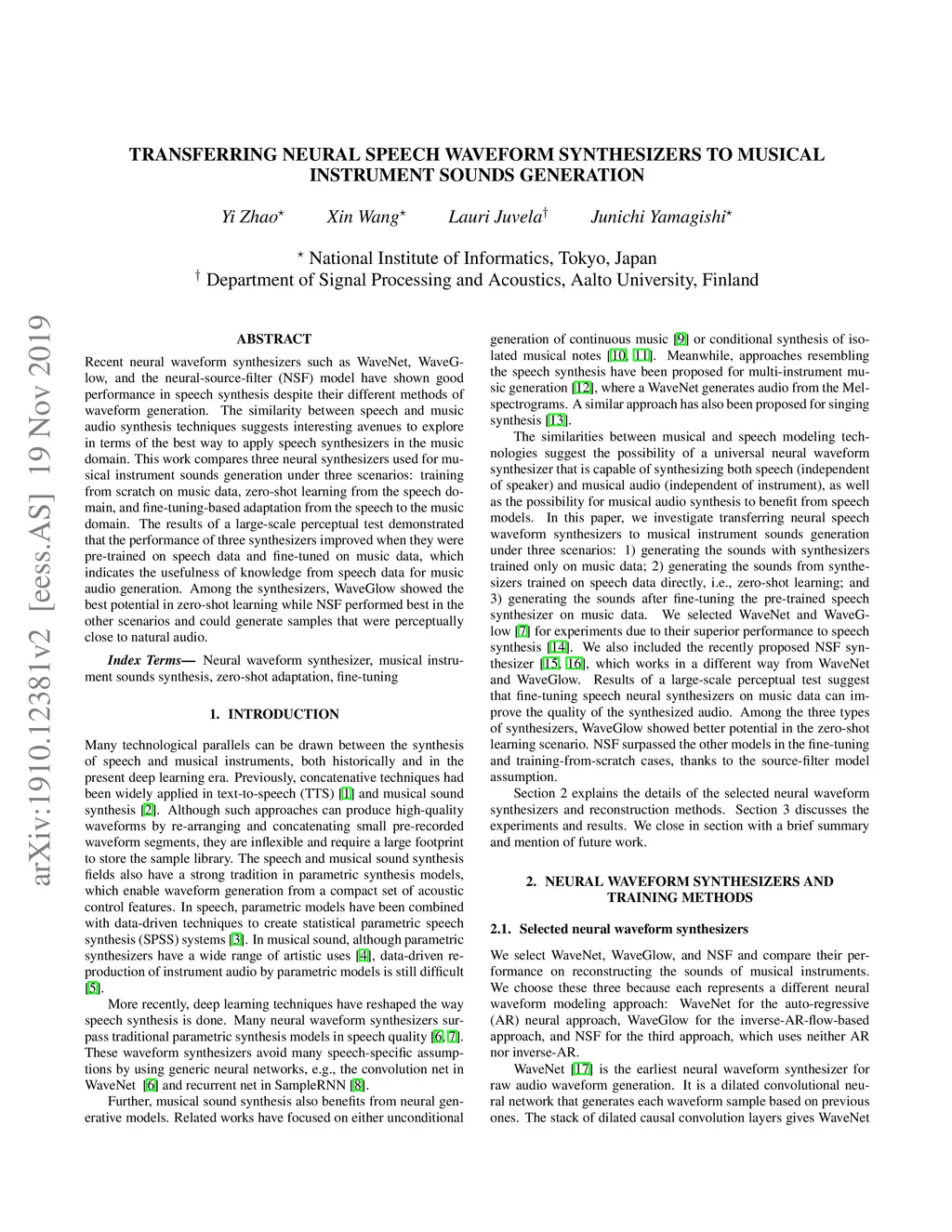 Transferring neural speech waveform synthesizers to musical instrument sounds generation