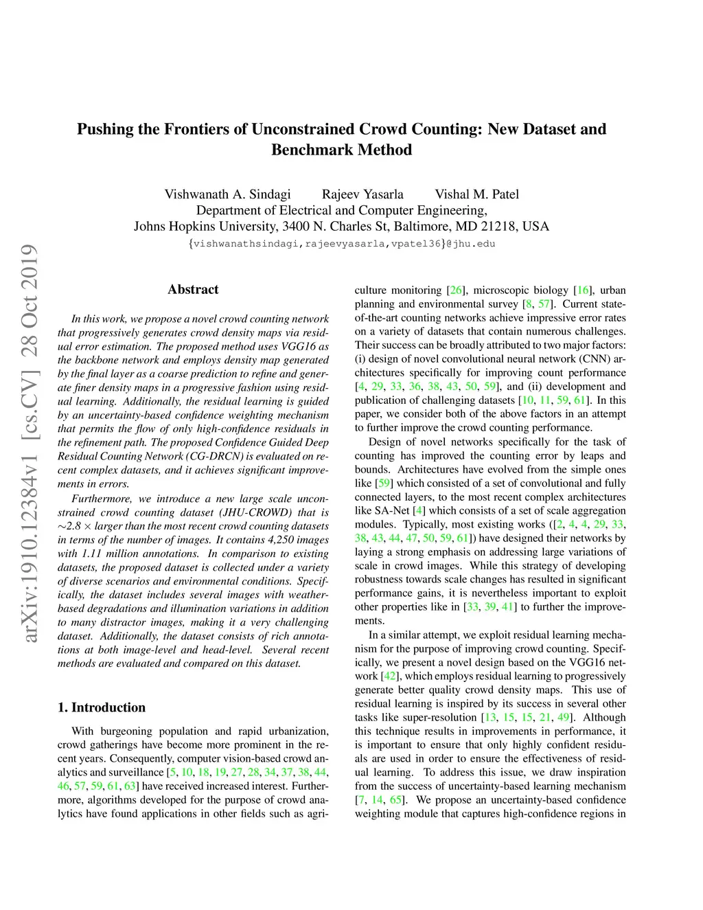 In this work, we propose a novel crowd counting network that progressively generates crowd density maps via residual error estimation. The proposed method uses VGG16 as the backbone network and employs density map generated by the final layer as a coarse prediction to refine and generate finer density maps in a progressive fashion using residual learning. Additionally, the residual learning is guided by an uncertainty-based confidence weighting mechanism that permits the flow of only high-confidence residuals in the refinement path. The proposed Confidence Guided Deep Residual Counting Network (CG-DRCN) is evaluated on recent complex datasets, and it achieves significant improvements in errors. Furthermore, we introduce a new large scale unconstrained crowd counting dataset (JHU-CROWD) that is ~2.8 larger than the most recent crowd counting datasets in terms of the number of images. It contains 4,250 images with 1.11 million annotations. In comparison to existing datasets, the proposed dataset is collected under a variety of diverse scenarios and environmental conditions. Specifically, the dataset includes several images with weather-based degradations and illumination variations in addition to many distractor images, making it a very challenging dataset. Additionally, the dataset consists of rich annotations at both image-level and head-level. Several recent methods are evaluated and compared on this dataset.