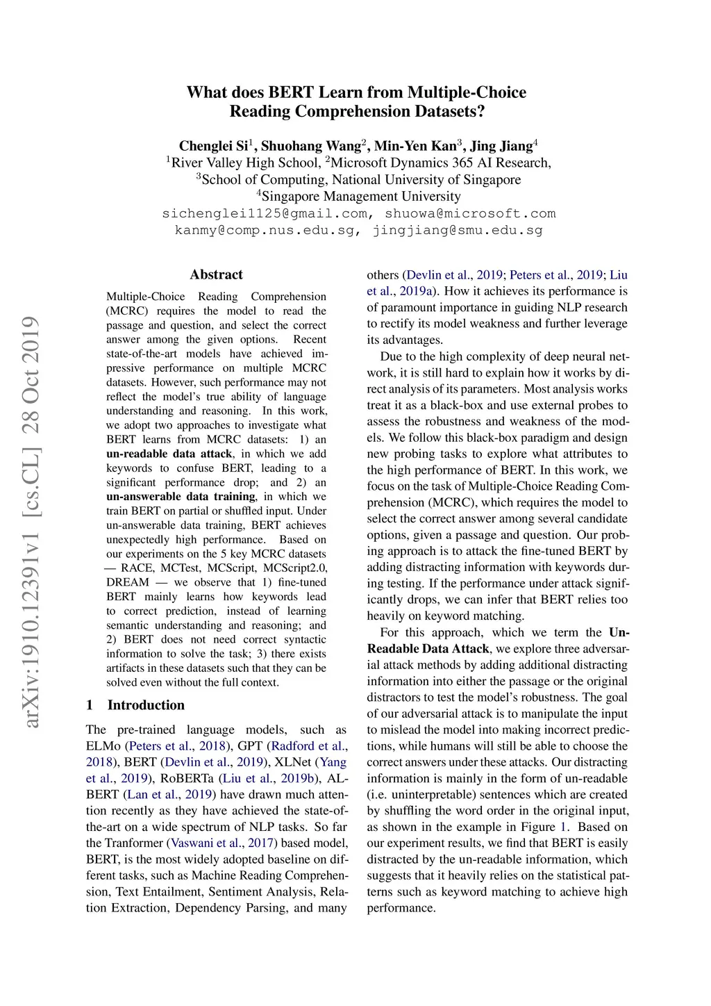 Multiple-Choice Reading Comprehension (MCRC) requires the model to read the passage and question, and select the correct answer among the given options. Recent state-of-the-art models have achieved impressive performance on multiple MCRC datasets. However, such performance may not reflect the model's true ability of language understanding and reasoning. In this work, we adopt two approaches to investigate what BERT learns from MCRC datasets: 1) an un-readable data attack, in which we add keywords to confuse BERT, leading to a significant performance drop; and 2) an un-answerable data training, in which we train BERT on partial or shuffled input. Under un-answerable data training, BERT achieves unexpectedly high performance. Based on our experiments on the 5 key MCRC datasets - RACE, MCTest, MCScript, MCScript2.0, DREAM - we observe that 1) fine-tuned BERT mainly learns how keywords lead to correct prediction, instead of learning semantic understanding and reasoning; and 2) BERT does not need correct syntactic information to solve the task; 3) there exists artifacts in these datasets such that they can be solved even without the full context.