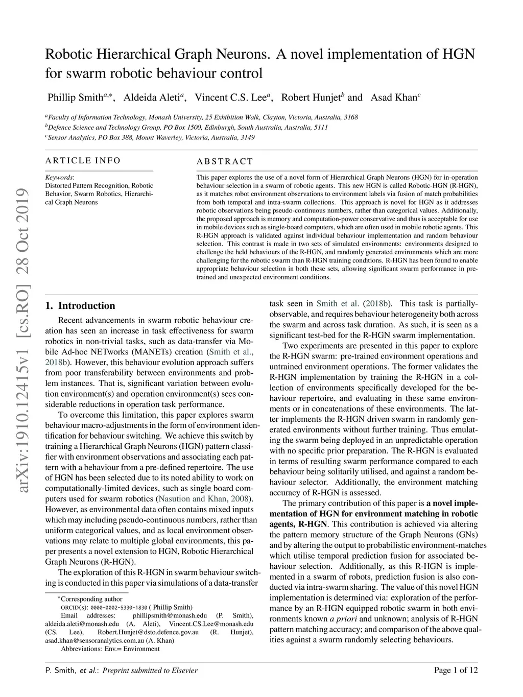 This paper explores the use of a novel form of Hierarchical Graph Neurons (HGN) for in-operation behaviour selection in a swarm of robotic agents. This new HGN is called Robotic-HGN (R-HGN), as it matches robot environment observations to environment labels via fusion of match probabilities from both temporal and intra-swarm collections. This approach is novel for HGN as it addresses robotic observations being pseudo-continuous numbers, rather than categorical values. Additionally, the proposed approach is memory and computation-power conservative and thus is acceptable for use in mobile devices such as single-board computers, which are often used in mobile robotic agents. This R-HGN approach is validated against individual behaviour implementation and random behaviour selection. This contrast is made in two sets of simulated environments: environments designed to challenge the held behaviours of the R-HGN, and randomly generated environments which are more challenging for the robotic swarm than R-HGN training conditions. R-HGN has been found to enable appropriate behaviour selection in both these sets, allowing significant swarm performance in pre-trained and unexpected environment conditions.
