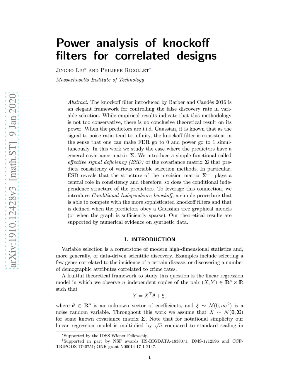The knockoff filter introduced by Barber and Cand\`es 2016 is an elegant framework for controlling the false discovery rate in variable selection. While empirical results indicate that this methodology is not too conservative, there is no conclusive theoretical result on its power. When the predictors are i.i.d. Gaussian, it is known that as the signal to noise ratio tend to infinity, the knockoff filter is consistent in the sense that one can make FDR go to 0 and power go to 1 simultaneously. In this work we study the case where the predictors have a general covariance matrix . We introduce a simple functional called effective signal deficiency (ESD) of the covariance matrix that predicts consistency of various variable selection methods. In particular, ESD reveals that the structure of the precision matrix plays a central role in consistency and therefore, so does the conditional independence structure of the predictors. To leverage this connection, we introduce Conditional Independence knockoff, a simple procedure that is able to compete with the more sophisticated knockoff filters and that is defined when the predictors obey a Gaussian tree graphical models (or when the graph is sufficiently sparse). Our theoretical results are supported by numerical evidence on synthetic data.