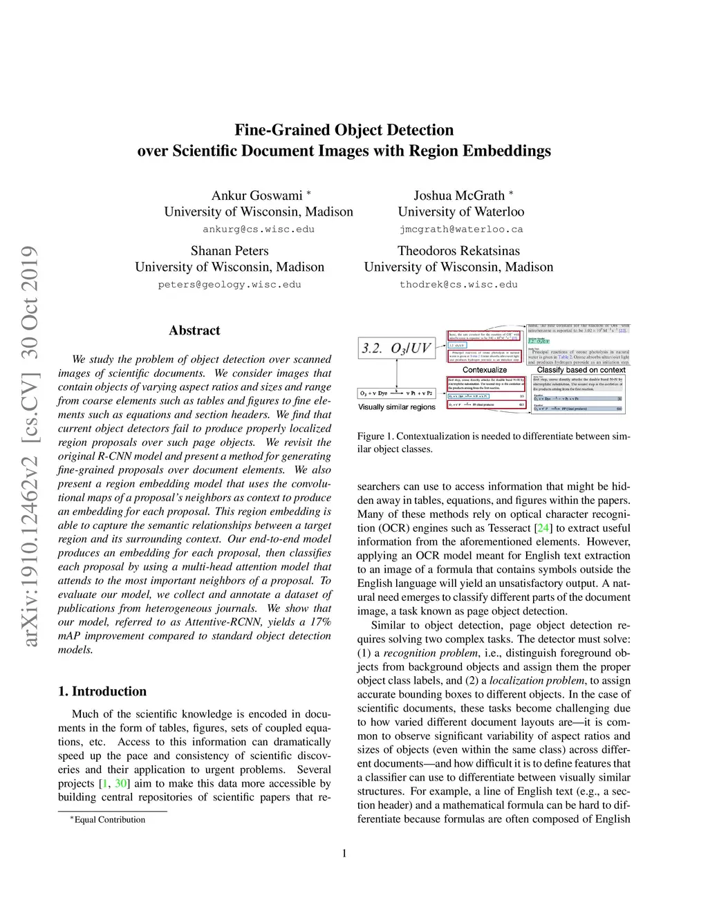 We study the problem of object detection over scanned images of scientific documents. We consider images that contain objects of varying aspect ratios and sizes and range from coarse elements such as tables and figures to fine elements such as equations and section headers. We find that current object detectors fail to produce properly localized region proposals over such page objects. We revisit the original R-CNN model and present a method for generating fine-grained proposals over document elements. We also present a region embedding model that uses the convolutional maps of a proposal's neighbors as context to produce an embedding for each proposal. This region embedding is able to capture the semantic relationships between a target region and its surrounding context. Our end-to-end model produces an embedding for each proposal, then classifies each proposal by using a multi-head attention model that attends to the most important neighbors of a proposal. To evaluate our model, we collect and annotate a dataset of publications from heterogeneous journals. We show that our model, referred to as Attentive-RCNN, yields a 17% mAP improvement compared to standard object detection models.