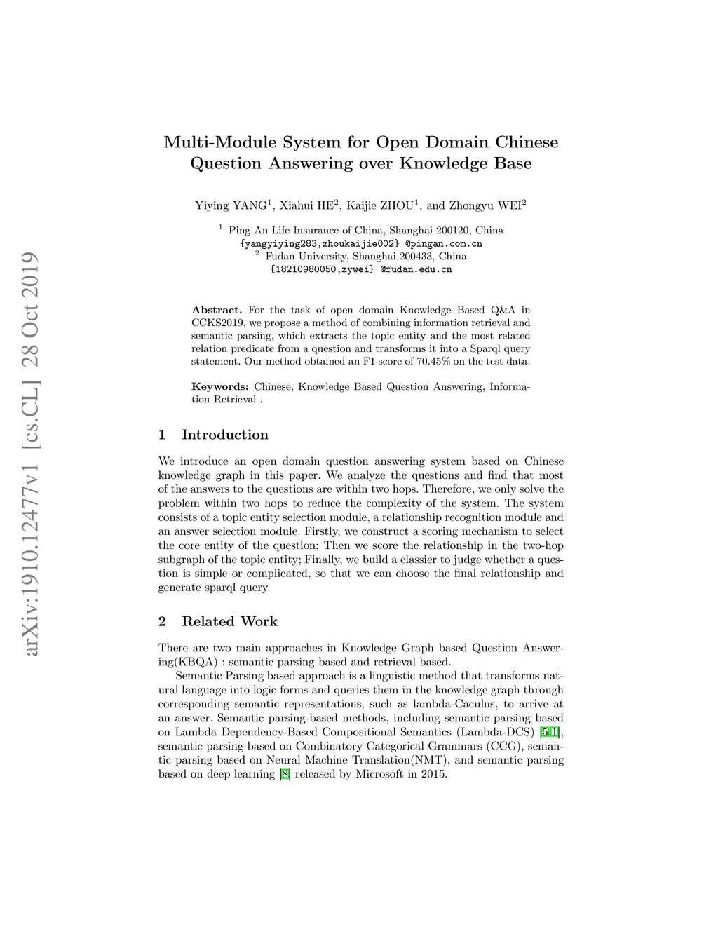 For the task of open domain Knowledge Based Question Answering in CCKS2019, we propose a method combining information retrieval and semantic parsing. This multi-module system extracts the topic entity and the most related relation predicate from a question and transforms it into a Sparql query statement. Our method obtained the F1 score of 70.45% on the test data.