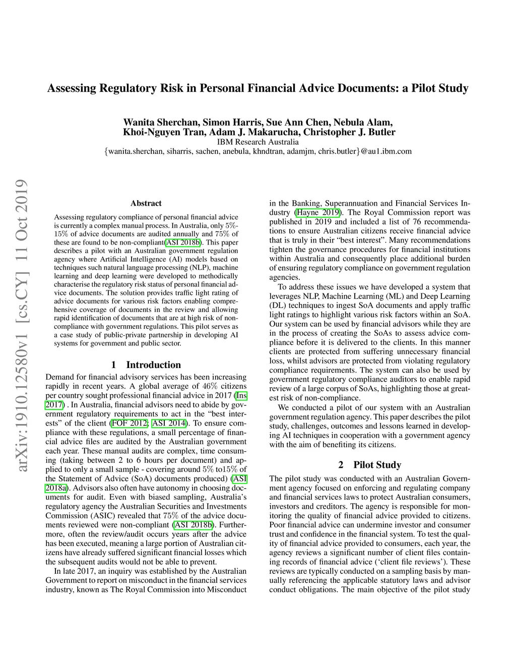 Assessing regulatory compliance of personal financial advice is currently a complex manual process. In Australia, only 5%- 15% of advice documents are audited annually and 75% of these are found to be non-compliant(ASI 2018b). This paper describes a pilot with an Australian government regulation agency where Artificial Intelligence (AI) models based on techniques such natural language processing (NLP), machine learning and deep learning were developed to methodically characterise the regulatory risk status of personal financial advice documents. The solution provides traffic light rating of advice documents for various risk factors enabling comprehensive coverage of documents in the review and allowing rapid identification of documents that are at high risk of non-compliance with government regulations. This pilot serves as a case study of public-private partnership in developing AI systems for government and public sector.