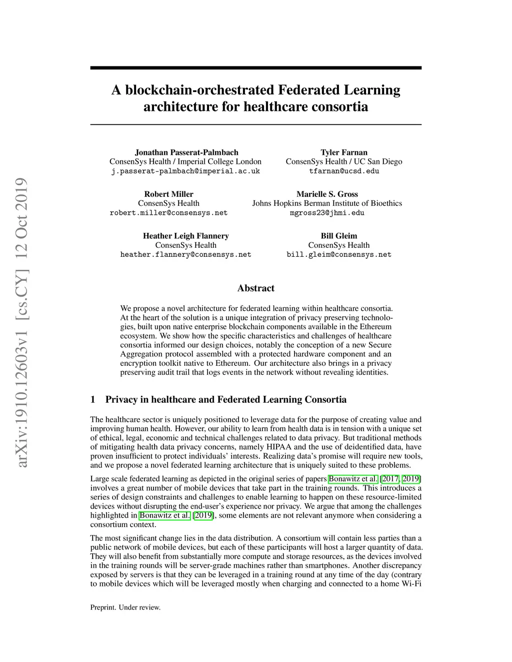 We propose a novel architecture for federated learning within healthcare consortia. At the heart of the solution is a unique integration of privacy preserving technologies, built upon native enterprise blockchain components available in the Ethereum ecosystem. We show how the specific characteristics and challenges of healthcare consortia informed our design choices, notably the conception of a new Secure Aggregation protocol assembled with a protected hardware component and an encryption toolkit native to Ethereum. Our architecture also brings in a privacy preserving audit trail that logs events in the network without revealing identities.
