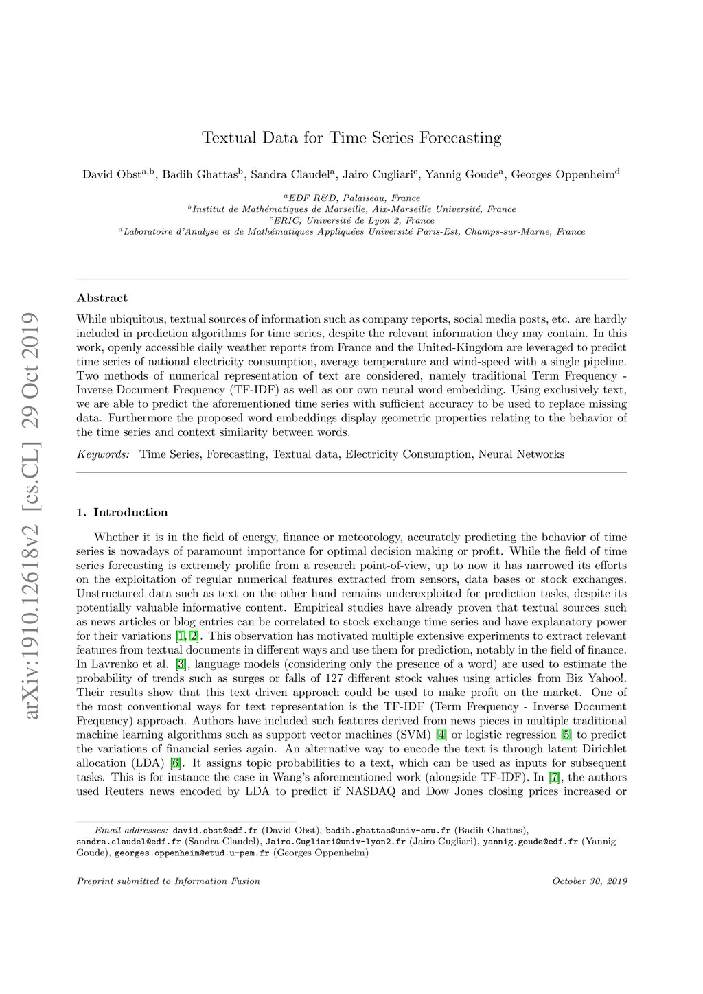 While ubiquitous, textual sources of information such as company reports, social media posts, etc. are hardly included in prediction algorithms for time series, despite the relevant information they may contain. In this work, openly accessible daily weather reports from France and the United-Kingdom are leveraged to predict time series of national electricity consumption, average temperature and wind-speed with a single pipeline. Two methods of numerical representation of text are considered, namely traditional Term Frequency - Inverse Document Frequency (TF-IDF) as well as our own neural word embedding. Using exclusively text, we are able to predict the aforementioned time series with sufficient accuracy to be used to replace missing data. Furthermore the proposed word embeddings display geometric properties relating to the behavior of the time series and context similarity between words.