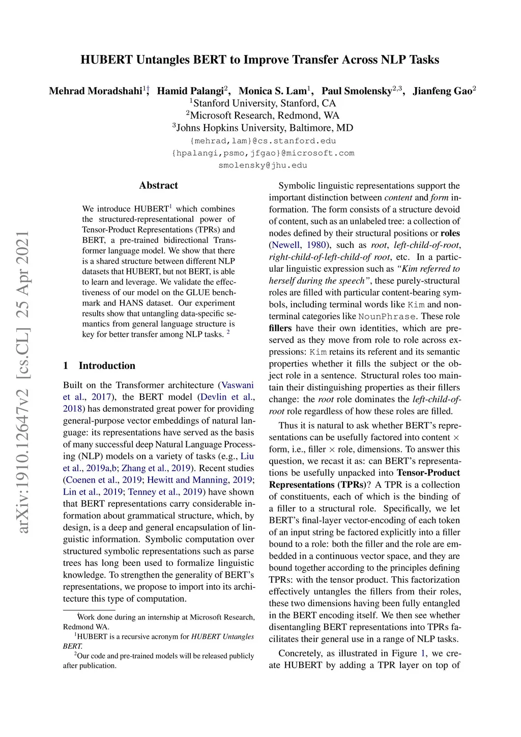 We introduce HUBERT which combines the structured-representational power of Tensor-Product Representations (TPRs) and BERT, a pre-trained bidirectional Transformer language model. We show that there is shared structure between different NLP datasets that HUBERT, but not BERT, is able to learn and leverage. We validate the effectiveness of our model on the GLUE benchmark and HANS dataset. Our experiment results show that untangling data-specific semantics from general language structure is key for better transfer among NLP tasks.