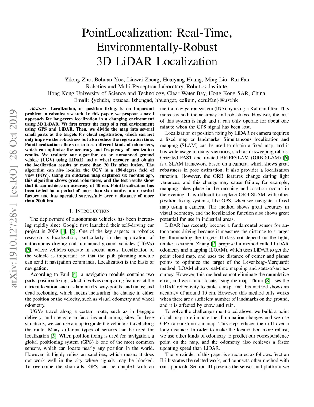 Localization, or position fixing, is an important problem in robotics research. In this paper, we propose a novel approach for long-term localization in a changing environment using 3D LiDAR. We first create the map of a real environment using GPS and LiDAR. Then, we divide the map into several small parts as the targets for cloud registration, which can not only improve the robustness but also reduce the registration time. PointLocalization allows us to fuse different kinds of odometers, which can optimize the accuracy and frequency of localization results. We evaluate our algorithm on an unmanned ground vehicle (UGV) using LiDAR and a wheel encoder, and obtain the localization results at more than 20 Hz after fusion. The algorithm can also localize the UGV in a 180-degree field of view (FOV). Using an outdated map captured six months ago, this algorithm shows great robustness, and the test results show that it can achieve an accuracy of 10 cm. PointLocalization has been tested for a period of more than six months in a crowded factory and has operated successfully over a distance of more than 2000 km.
