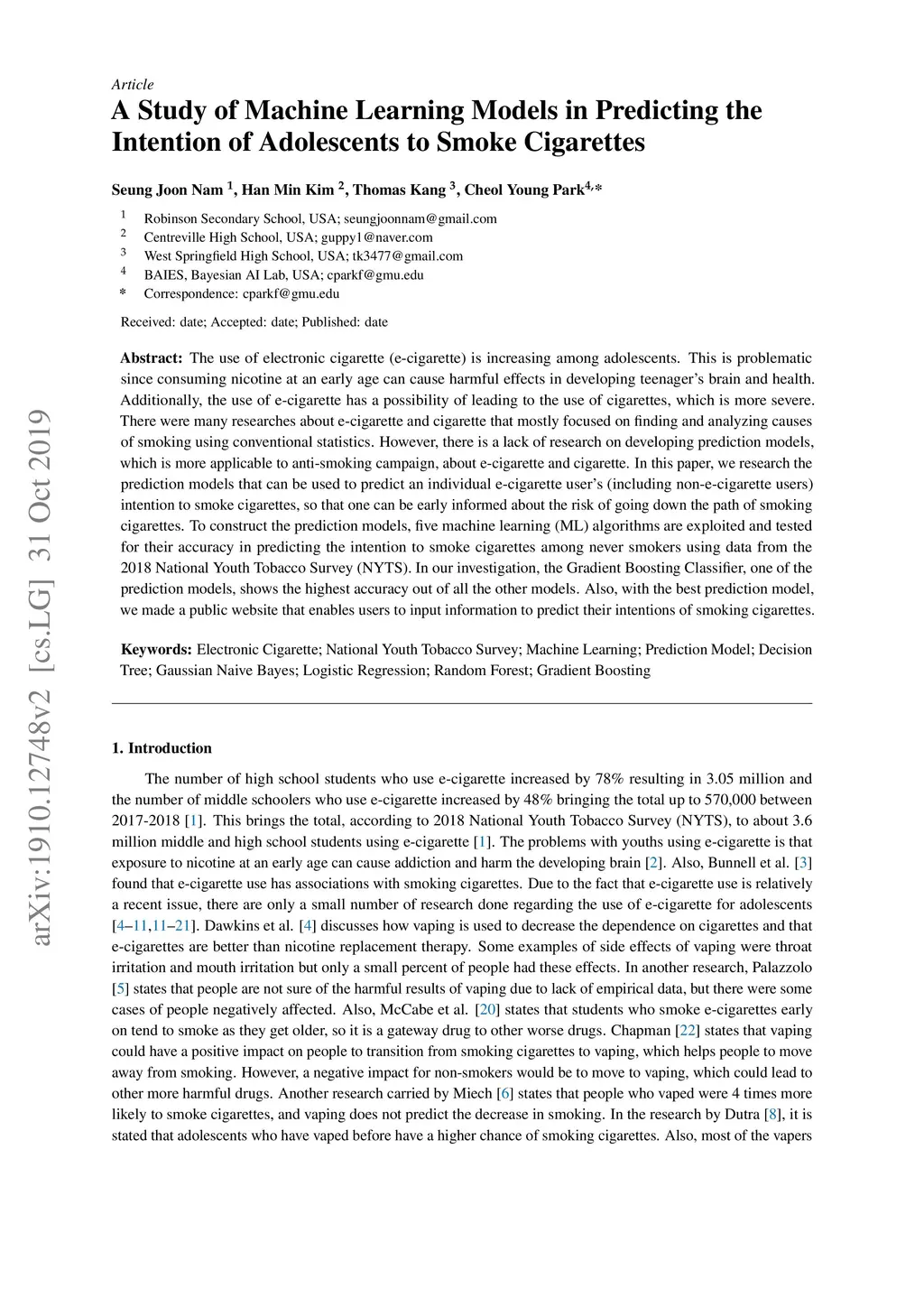 The use of electronic cigarette (e-cigarette) is increasing among adolescents. This is problematic since consuming nicotine at an early age can cause harmful effects in developing teenager's brain and health. Additionally, the use of e-cigarette has a possibility of leading to the use of cigarettes, which is more severe. There were many researches about e-cigarette and cigarette that mostly focused on finding and analyzing causes of smoking using conventional statistics. However, there is a lack of research on developing prediction models, which is more applicable to anti-smoking campaign, about e-cigarette and cigarette. In this paper, we research the prediction models that can be used to predict an individual e-cigarette user's (including non-e-cigarette users) intention to smoke cigarettes, so that one can be early informed about the risk of going down the path of smoking cigarettes. To construct the prediction models, five machine learning (ML) algorithms are exploited and tested for their accuracy in predicting the intention to smoke cigarettes among never smokers using data from the 2018 National Youth Tobacco Survey (NYTS). In our investigation, the Gradient Boosting Classifier, one of the prediction models, shows the highest accuracy out of all the other models. Also, with the best prediction model, we made a public website that enables users to input information to predict their intentions of smoking cigarettes.