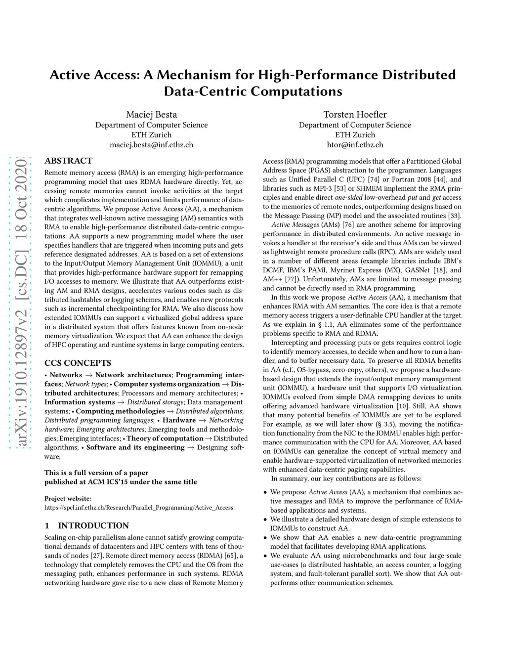 Remote memory access (RMA) is an emerging high-performance programming model that uses RDMA hardware directly. Yet, accessing remote memories cannot invoke activities at the target which complicates implementation and limits performance of data-centric algorithms. We propose Active Access (AA), a mechanism that integrates well-known active messaging (AM) semantics with RMA to enable high-performance distributed data-centric computations. AA supports a new programming model where the user specifies handlers that are triggered when incoming puts and gets reference designated addresses. AA is based on a set of extensions to the Input/Output Memory Management Unit (IOMMU), a unit that provides high-performance hardware support for remapping I/O accesses to memory. We illustrate that AA outperforms existing AM and RMA designs, accelerates various codes such as distributed hashtables or logging schemes, and enables new protocols such as incremental checkpointing for RMA.We also discuss how extended IOMMUs can support a virtualized global address space in a distributed system that offers features known from on-node memory virtualization. We expect that AA can enhance the design of HPC operating and runtime systems in large computing centers.