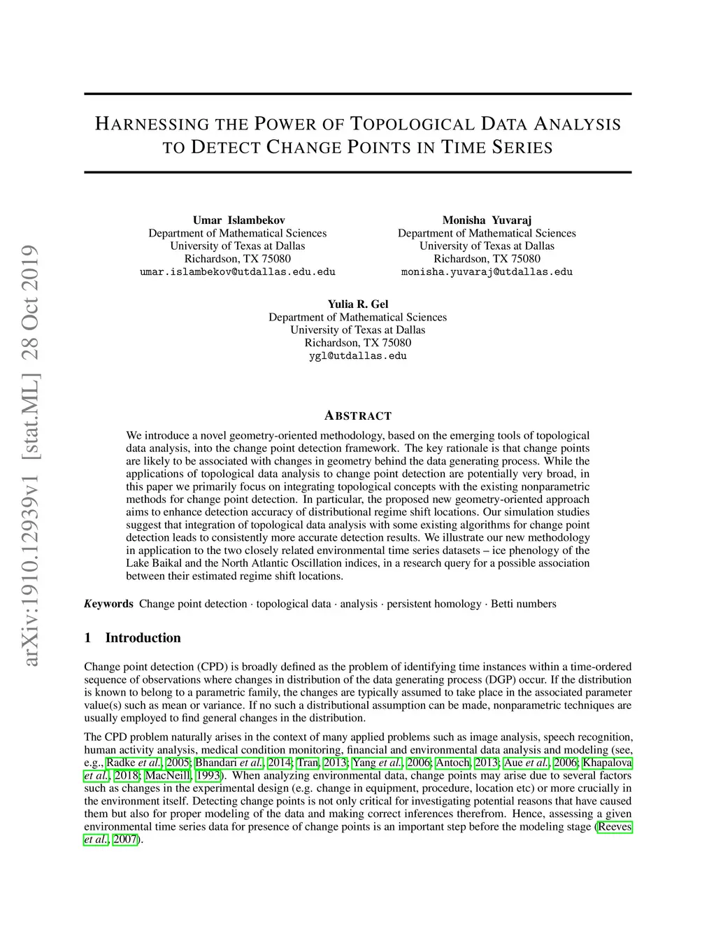 We introduce a novel geometry-oriented methodology, based on the emerging tools of topological data analysis, into the change point detection framework. The key rationale is that change points are likely to be associated with changes in geometry behind the data generating process. While the applications of topological data analysis to change point detection are potentially very broad, in this paper we primarily focus on integrating topological concepts with the existing nonparametric methods for change point detection. In particular, the proposed new geometry-oriented approach aims to enhance detection accuracy of distributional regime shift locations. Our simulation studies suggest that integration of topological data analysis with some existing algorithms for change point detection leads to consistently more accurate detection results. We illustrate our new methodology in application to the two closely related environmental time series datasets -ice phenology of the Lake Baikal and the North Atlantic Oscillation indices, in a research query for a possible association between their estimated regime shift locations.