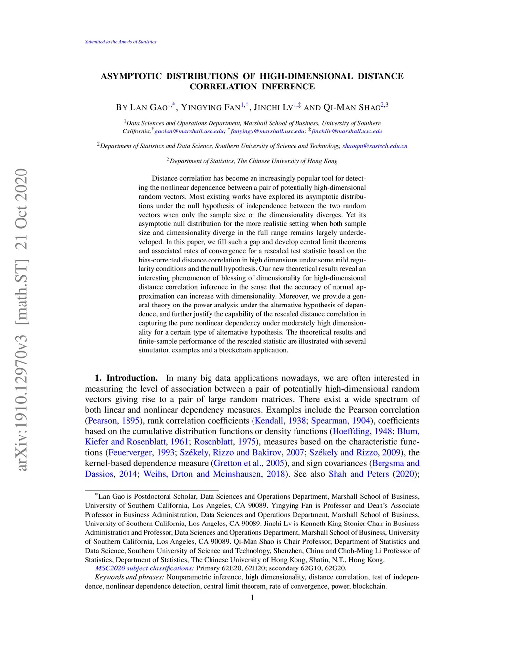 Distance correlation has become an increasingly popular tool for detecting the nonlinear dependence between a pair of potentially high-dimensional random vectors. Most existing works have explored its asymptotic distributions under the null hypothesis of independence between the two random vectors when only the sample size or the dimensionality diverges. Yet its asymptotic null distribution for the more realistic setting when both sample size and dimensionality diverge in the full range remains largely underdeveloped. In this paper, we fill such a gap and develop central limit theorems and associated rates of convergence for a rescaled test statistic based on the bias-corrected distance correlation in high dimensions under some mild regularity conditions and the null hypothesis. Our new theoretical results reveal an interesting phenomenon of blessing of dimensionality for high-dimensional distance correlation inference in the sense that the accuracy of normal approximation can increase with dimensionality. Moreover, we provide a general theory on the power analysis under the alternative hypothesis of dependence, and further justify the capability of the rescaled distance correlation in capturing the pure nonlinear dependency under moderately high dimensionality for a certain type of alternative hypothesis. The theoretical results and finite-sample performance of the rescaled statistic are illustrated with several simulation examples and a blockchain application.