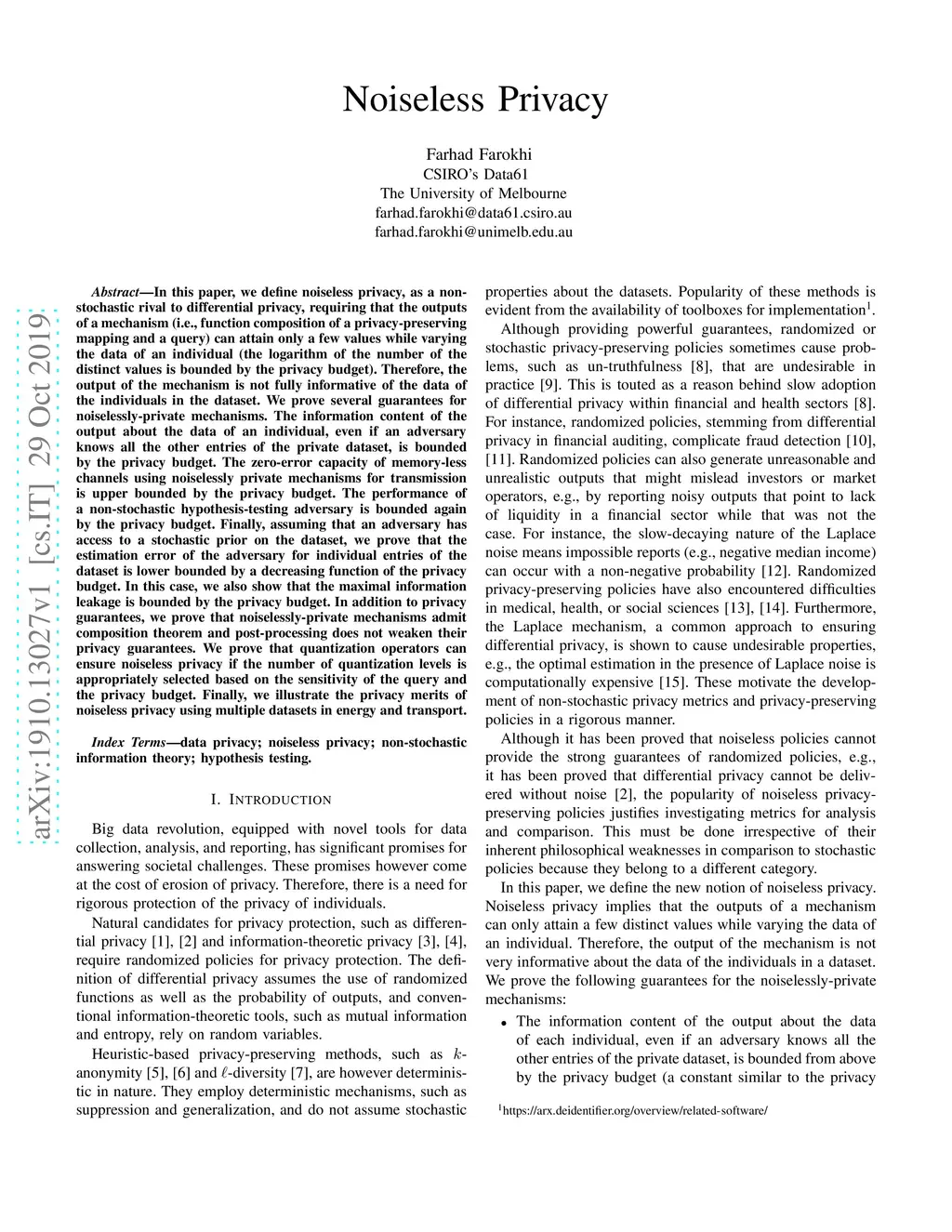 In this paper, we define noiseless privacy, as a non-stochastic rival to differential privacy, requiring that the outputs of a mechanism (i.e., function composition of a privacy-preserving mapping and a query) can attain only a few values while varying the data of an individual (the logarithm of the number of the distinct values is bounded by the privacy budget). Therefore, the output of the mechanism is not fully informative of the data of the individuals in the dataset. We prove several guarantees for noiselessly-private mechanisms. The information content of the output about the data of an individual, even if an adversary knows all the other entries of the private dataset, is bounded by the privacy budget. The zero-error capacity of memory-less channels using noiselessly private mechanisms for transmission is upper bounded by the privacy budget. The performance of a non-stochastic hypothesis-testing adversary is bounded again by the privacy budget. Finally, assuming that an adversary has access to a stochastic prior on the dataset, we prove that the estimation error of the adversary for individual entries of the dataset is lower bounded by a decreasing function of the privacy budget. In this case, we also show that the maximal information leakage is bounded by the privacy budget. In addition to privacy guarantees, we prove that noiselessly-private mechanisms admit composition theorem and post-processing does not weaken their privacy guarantees. We prove that quantization operators can ensure noiseless privacy if the number of quantization levels is appropriately selected based on the sensitivity of the query and the privacy budget. Finally, we illustrate the privacy merits of noiseless privacy using multiple datasets in energy and transport.