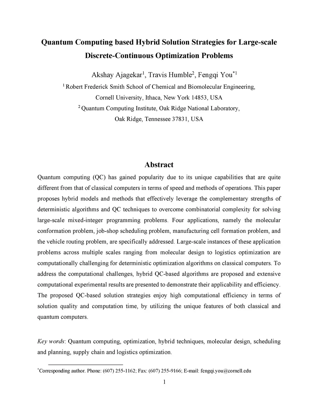Quantum computing (QC) has gained popularity due to its unique capabilities that are quite different from that of classical computers in terms of speed and methods of operations. This paper proposes hybrid models and methods that effectively leverage the complementary strengths of deterministic algorithms and QC techniques to overcome combinatorial complexity for solving large-scale mixed-integer programming problems. Four applications, namely the molecular conformation problem, job-shop scheduling problem, manufacturing cell formation problem, and the vehicle routing problem, are specifically addressed. Large-scale instances of these application problems across multiple scales ranging from molecular design to logistics optimization are computationally challenging for deterministic optimization algorithms on classical computers. To address the computational challenges, hybrid QC-based algorithms are proposed and extensive computational experimental results are presented to demonstrate their applicability and efficiency. The proposed QC-based solution strategies enjoy high computational efficiency in terms of solution quality and computation time, by utilizing the unique features of both classical and quantum computers.