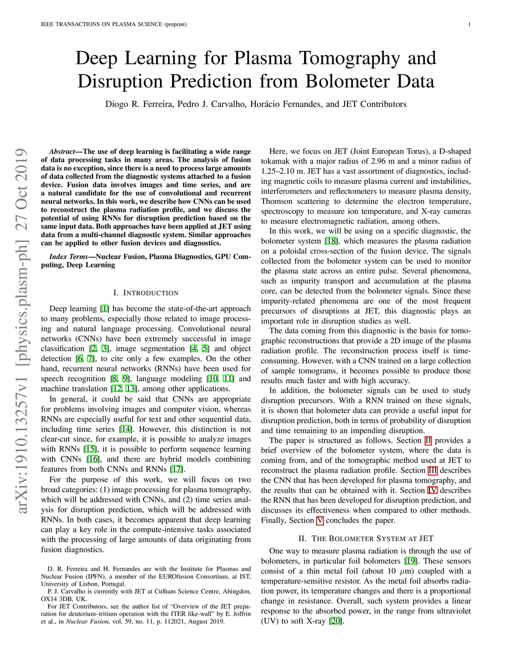 The use of deep learning is facilitating a wide range of data processing tasks in many areas. The analysis of fusion data is no exception, since there is a need to process large amounts of data collected from the diagnostic systems attached to a fusion device. Fusion data involves images and time series, and are a natural candidate for the use of convolutional and recurrent neural networks. In this work, we describe how CNNs can be used to reconstruct the plasma radiation profile, and we discuss the potential of using RNNs for disruption prediction based on the same input data. Both approaches have been applied at JET using data from a multi-channel diagnostic system. Similar approaches can be applied to other fusion devices and diagnostics.