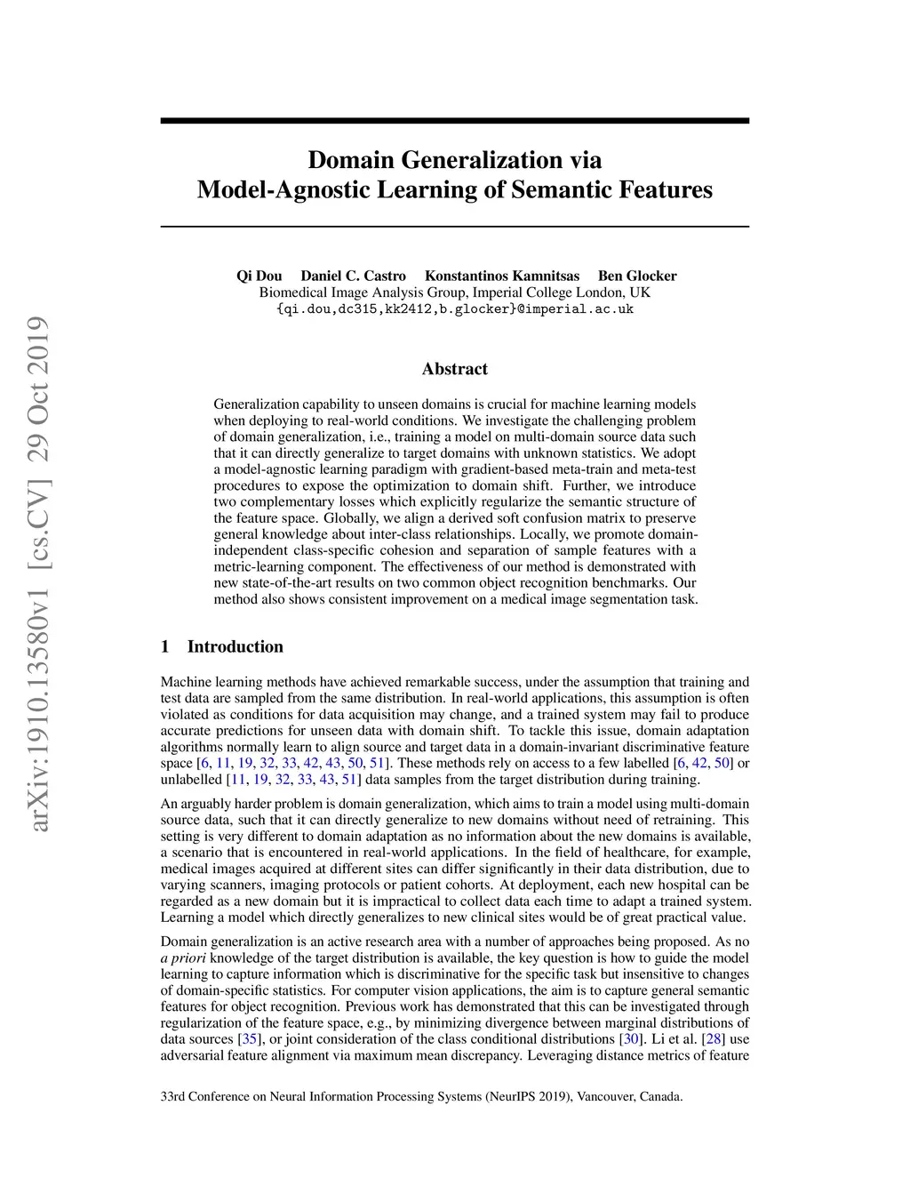 Domain Generalization via Model-Agnostic Learning of Semantic Features