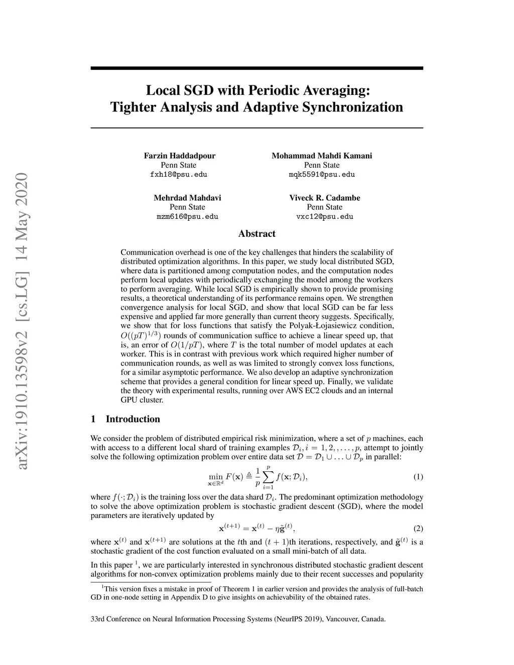 Communication overhead is one of the key challenges that hinders the scalability of distributed optimization algorithms. In this paper, we study local distributed SGD, where data is partitioned among computation nodes, and the computation nodes perform local updates with periodically exchanging the model among the workers to perform averaging. While local SGD is empirically shown to provide promising results, a theoretical understanding of its performance remains open. We strengthen convergence analysis for local SGD, and show that local SGD can be far less expensive and applied far more generally than current theory suggests. Specifically, we show that for loss functions that satisfy the Polyak-{\L}ojasiewicz condition, rounds of communication suffice to achieve a linear speed up, that is, an error of , where is the total number of model updates at each worker. This is in contrast with previous work which required higher number of communication rounds, as well as was limited to strongly convex loss functions, for a similar asymptotic performance. We also develop an adaptive synchronization scheme that provides a general condition for linear speed up. Finally, we validate the theory with experimental results, running over AWS EC2 clouds and an internal GPU cluster.