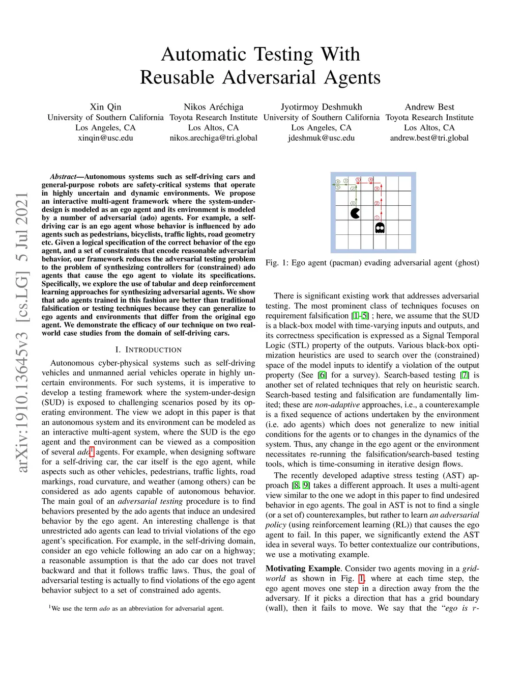 Autonomous systems such as self-driving cars and general-purpose robots are safety-critical systems that operate in highly uncertain and dynamic environments. We propose an interactive multi-agent framework where the system-under-design is modeled as an ego agent and its environment is modeled by a number of adversarial (ado) agents. For example, a self-driving car is an ego agent whose behavior is influenced by ado agents such as pedestrians, bicyclists, traffic lights, road geometry etc. Given a logical specification of the correct behavior of the ego agent, and a set of constraints that encode reasonable adversarial behavior, our framework reduces the adversarial testing problem to the problem of synthesizing controllers for (constrained) ado agents that cause the ego agent to violate its specifications. Specifically, we explore the use of tabular and deep reinforcement learning approaches for synthesizing adversarial agents. We show that ado agents trained in this fashion are better than traditional falsification or testing techniques because they can generalize to ego agents and environments that differ from the original ego agent. We demonstrate the efficacy of our technique on two real-world case studies from the domain of self-driving cars.