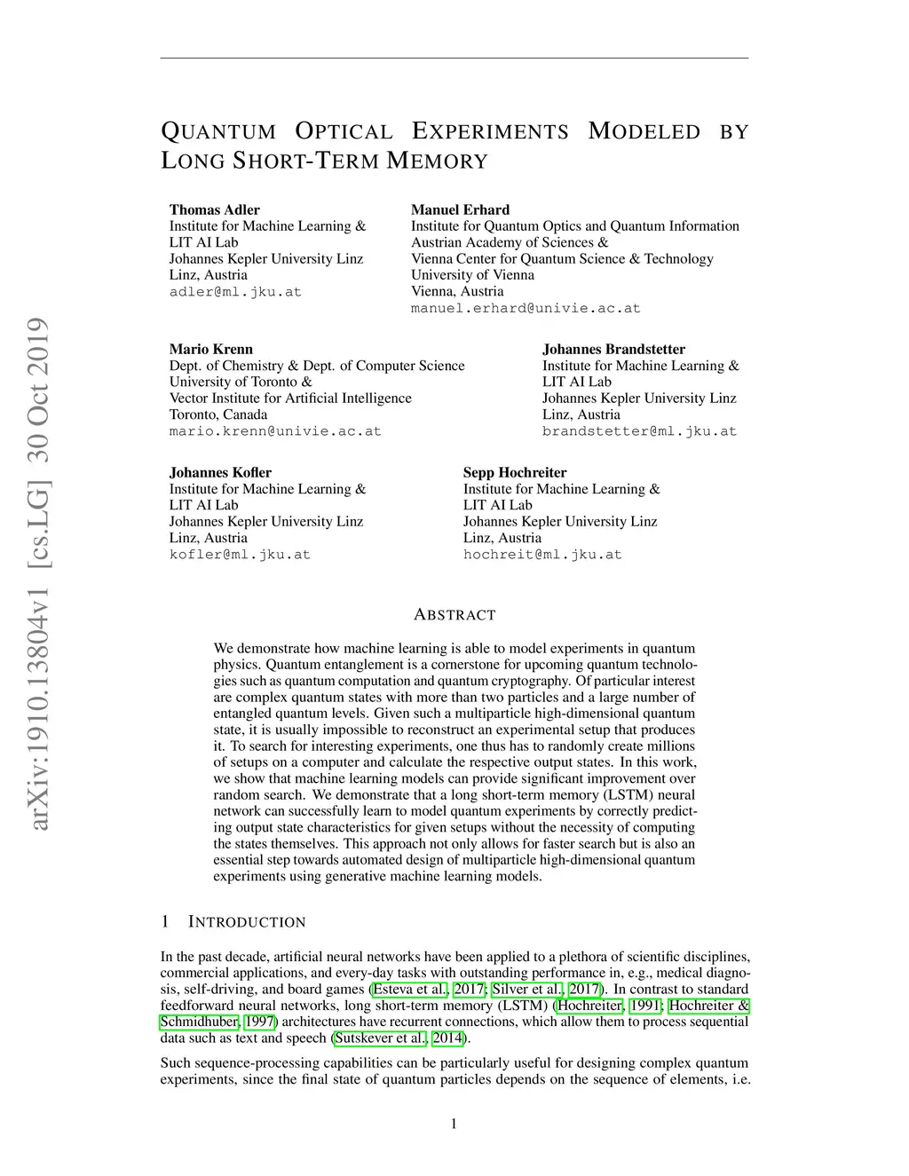 Quantum Optical Experiments Modeled by Long Short-Term Memory