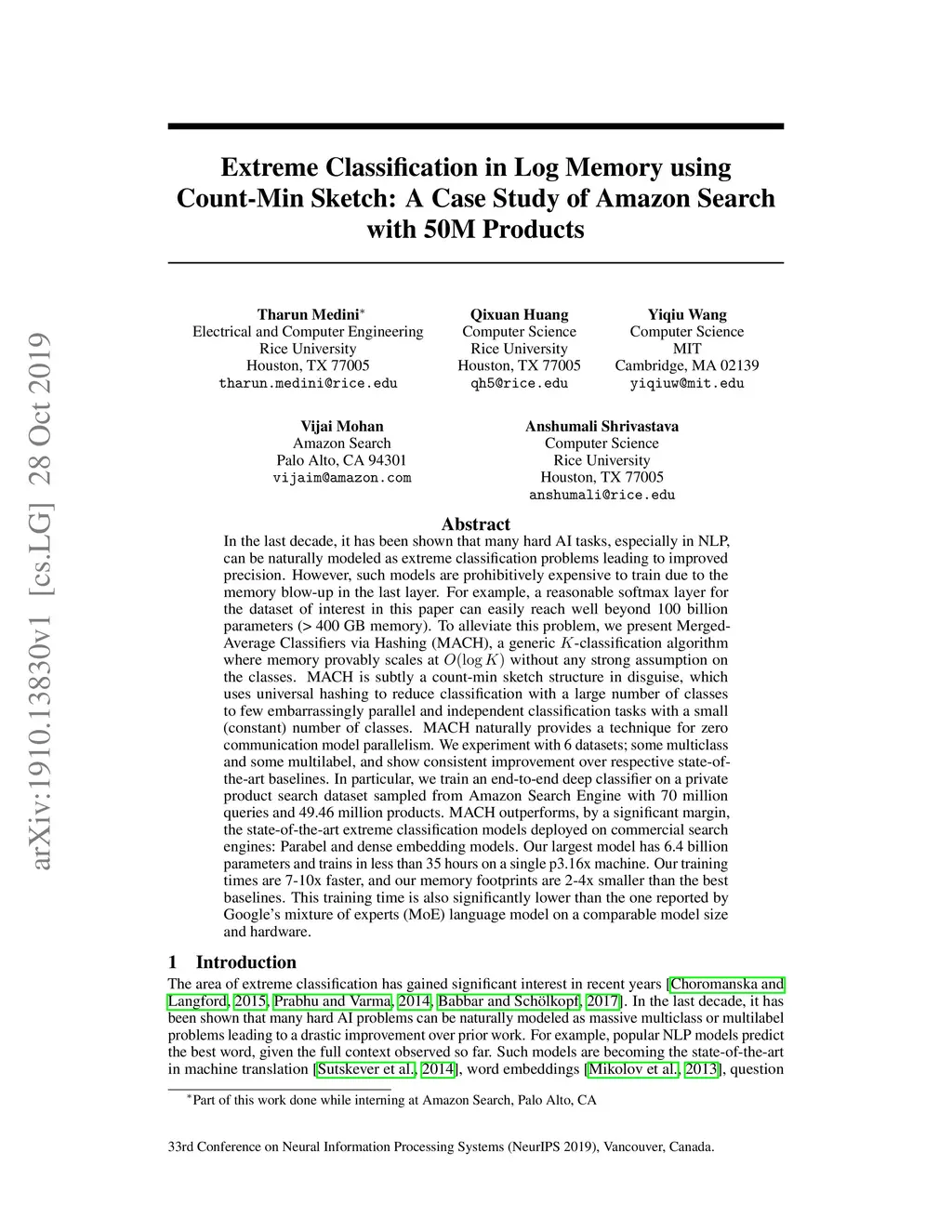 In the last decade, it has been shown that many hard AI tasks, especially in NLP, can be naturally modeled as extreme classification problems leading to improved precision. However, such models are prohibitively expensive to train due to the memory blow-up in the last layer. For example, a reasonable softmax layer for the dataset of interest in this paper can easily reach well beyond 100 billion parameters (>400 GB memory). To alleviate this problem, we present Merged-Average Classifiers via Hashing (MACH), a generic K-classification algorithm where memory provably scales at O(logK) without any strong assumption on the classes. MACH is subtly a count-min sketch structure in disguise, which uses universal hashing to reduce classification with a large number of classes to few embarrassingly parallel and independent classification tasks with a small (constant) number of classes. MACH naturally provides a technique for zero communication model parallelism. We experiment with 6 datasets; some multiclass and some multilabel, and show consistent improvement over respective state-of-the-art baselines. In particular, we train an end-to-end deep classifier on a private product search dataset sampled from Amazon Search Engine with 70 million queries and 49.46 million products. MACH outperforms, by a significant margin,the state-of-the-art extreme classification models deployed on commercial search engines: Parabel and dense embedding models. Our largest model has 6.4 billion parameters and trains in less than 35 hours on a single p3.16x machine. Our training times are 7-10x faster, and our memory footprints are 2-4x smaller than the best baselines. This training time is also significantly lower than the one reported by Google's mixture of experts (MoE) language model on a comparable model size and hardware.